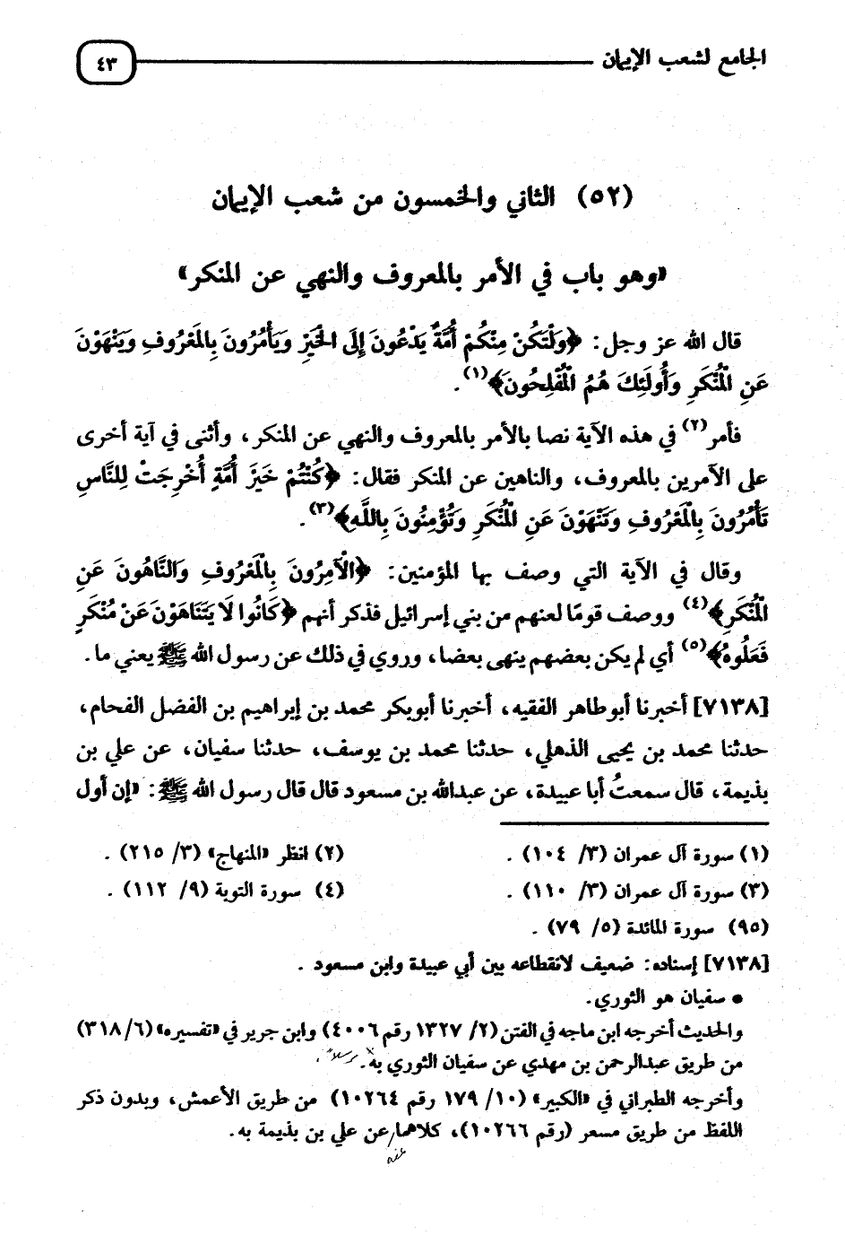 §الثَّانِي وَالْخَمْسُونَ مِنْ شُعَبِ الْإِيمَانِ وَهُوَ بَابٌ فِي الْأَمْرِ بِالْمَعْرُوفِ وَالنَّهْيِ عَنِ الْمُنْكَرِ " قَالَ اللهُ عَزَّ وَجَلَّ: {وَلْتَكُنْ مِنْكُمْ أُمَّةٌ يَدْعَونَ إِلَى الْخَيْرِ، ويَأْمُرونَ بِالْمَعْرُوفِ، وَيَنْهَوْنَ عَنِ الْمُنْكَرِ، وَأُولَئِكَ هُمُ الْمُفْلِحُونَ} [آل عمران: 104]: فَأَمَرَ فِي هَذِهِ الْآيَةِ نَصًّا بِالْأَمْرِ بِالْمَعْرُوفِ، وَالنَّهْيِ عَنِ الْمُنْكَرِ، وَأَثْنَى فِي آيَةٍ أُخْرَى عَلَى الْآمِرِينَ بِالْمَعْرُوفِ، والنَّاهِينَ عَنِ الْمُنْكَرِ، فَقَالَ: {كُنْتُمْ خَيْرَ أُمَّةٍ أُخْرِجَتْ لِلنَّاسِ تَأْمُرُونَ بِالْمَعْرُوفِ وَتَنْهَوْنَ عَنِ الْمُنْكَرِ} [آل عمران: 110] وَقَالَ: فِي الْآيَةِ الَّتِي وُصِفَ بِهَا الْمُؤْمِنُونَ {الْآمِرُونَ بِالْمَعْرُوفِ والنَّاهُونَ عَنِ الْمُنْكَرِ} [التوبة: 112] وَوَصَفَ قَوْمًا لَعَنَهُمْ مِنْ بَنِي إِسْرَائِيلَ فَذَكَرَ أَنَّهُمْ {لَا يَتَنَاهَوْنَ عَنْ مُنْكَرٍ فَعَلُوهُ} [المائدة: 79] أَيْ لَمْ يَكُنْ يَنْهَى بَعْضُهُمْ بَعْضًا، فَرُوِيَ فِي ذَلِكَ عَنْ رَسُولِ اللهِ صَلَّى اللَّهُ عَلَيْهِ وَسَلَّمَ، يَعْنِي "