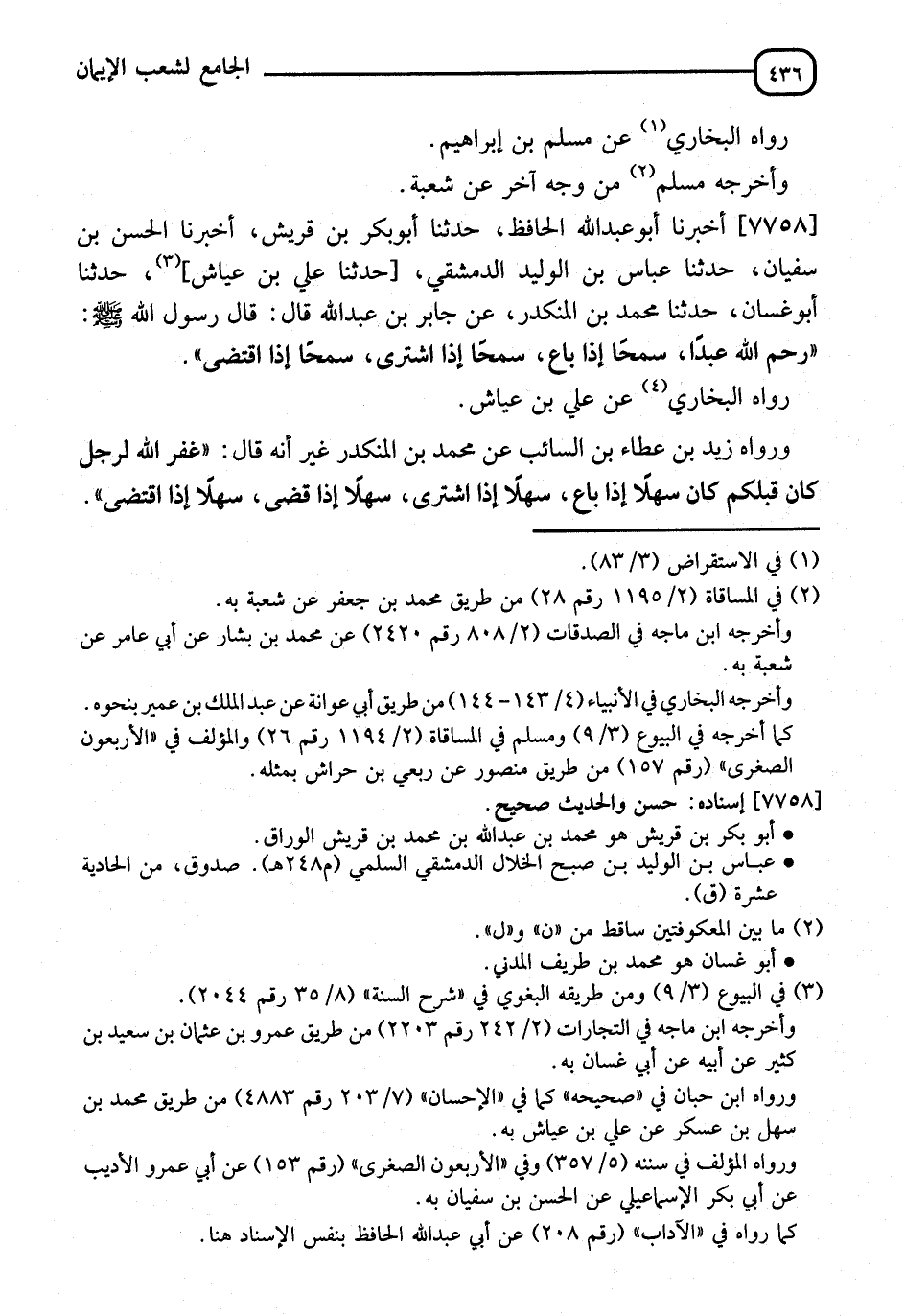 7758 - أَخْبَرَنَا مُحَمَّدُ بْنُ عَبْدِ اللهِ الْحَافِظُ، نا أَبُو بَكْرِ بْنُ قُرَيْشٍ، أنا الْحَسَنُ بْنُ سُفْيَانَ، نا عَبَّاسُ بْنُ الْوَلِيدِ الدِّمَشْقِيُّ، نا عَلِيُّ بْنُ عَيَّاشٍ، نا أَبُو غَسَّانَ، نا مُحَمَّدُ بْنُ الْمُنْكَدِرِ، عَنْ جَابِرِ بْنِ عَبْدِ اللهِ، قَالَ: قَالَ رَسُولُ اللهِ صَلَّى اللَّهُ عَلَيْهِ وَسَلَّمَ: " §رَحِمَ اللهُ عَبْدًا سَمْحًا إِذَا بَاعَ سَمْحًا، إِذَا اشْتَرَى سَمْحًا إِذَا اقْتَضَى " رَوَاهُ الْبُخَارِيُّ، عَنْ عَلِيِّ بْنِ عَيَّاشٍ