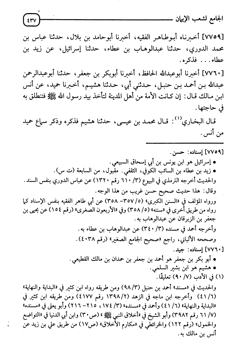 7760 - أَخْبَرَنَا أَبُو عَبْدِ اللهِ الْحَافِظُ، أنا أَبُو بَكْرِ بْنُ جَعْفَرٍ، نا أَبُو عَبْدِ الرَّحْمَنِ عَبْدُ اللهِ بْنُ أَحْمَدَ بْنِ حَنْبَلٍ، حَدَّثَنِي أَبِي، نا هُشَيْمٌ، أنا حُمَيْدٌ، عَنْ أَنَسِ بْنِ مَالِكٍ، قَالَ: " إِنْ كَانَتِ §الْأَمَةُ مِنْ أَهْلِ الْمَدِينَةِ لَتَأْخُذُ بِيَدِ رَسُولِ اللهِ صَلَّى اللَّهُ عَلَيْهِ وَسَلَّمَ، فَيَنْطَلِقَ بِهَا فِي حَاجَتِهَا " قَالَ الْبُخَارِيُّ: قَالَ مُحَمَّدُ بْنُ عِيسَى، نا هُشَيْمٌ، فَذَكَرَهُ، وَذَكَرَ سَمَاعَ حُمَيْدٍ، عَنْ أَنَسٍ