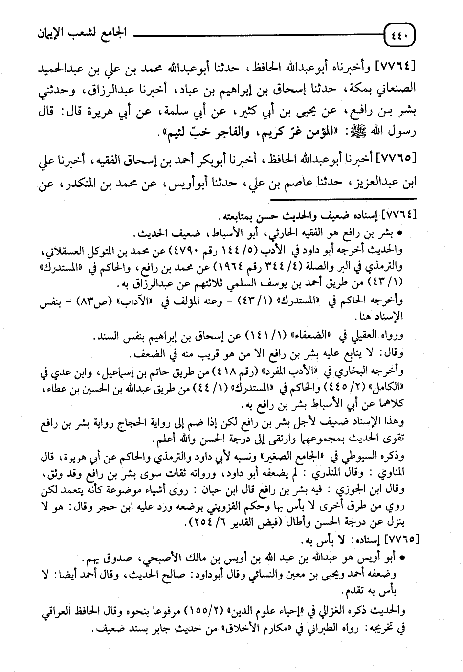 7764 - وَأَخْبَرَنَا أَبُو عَبْدِ اللهِ الْحَافِظُ، أنا أَبُو عَبْدِ اللهِ مُحَمَّدُ بْنُ عَلِيِّ بْنِ عَبْدِ الْحَمِيدِ الصَّنْعَانِيُّ بِمَكَّةَ، نا إِسْحَاقُ بْنُ إِبْرَاهِيمَ بْنِ عَبَّادٍ، أنا عَبْدُ الرَّزَّاقِ، حَدَّثَنِي بِشْرُ بْنُ رَافِعٍ، عَنْ يَحْيَى بْنِ أَبِي كَثِيرٍ، عَنْ أَبِي سَلَمَةَ، عَنْ أَبِي هُرَيْرَةَ، قَالَ: قَالَ رَسُولُ اللهِ صَلَّى اللَّهُ عَلَيْهِ وَسَلَّمَ: " §الْمُؤْمِنُ غِرٌّ كَرِيمٌ، وَالْفَاجِرٌ خَبٌّ لَئِيمٌ "