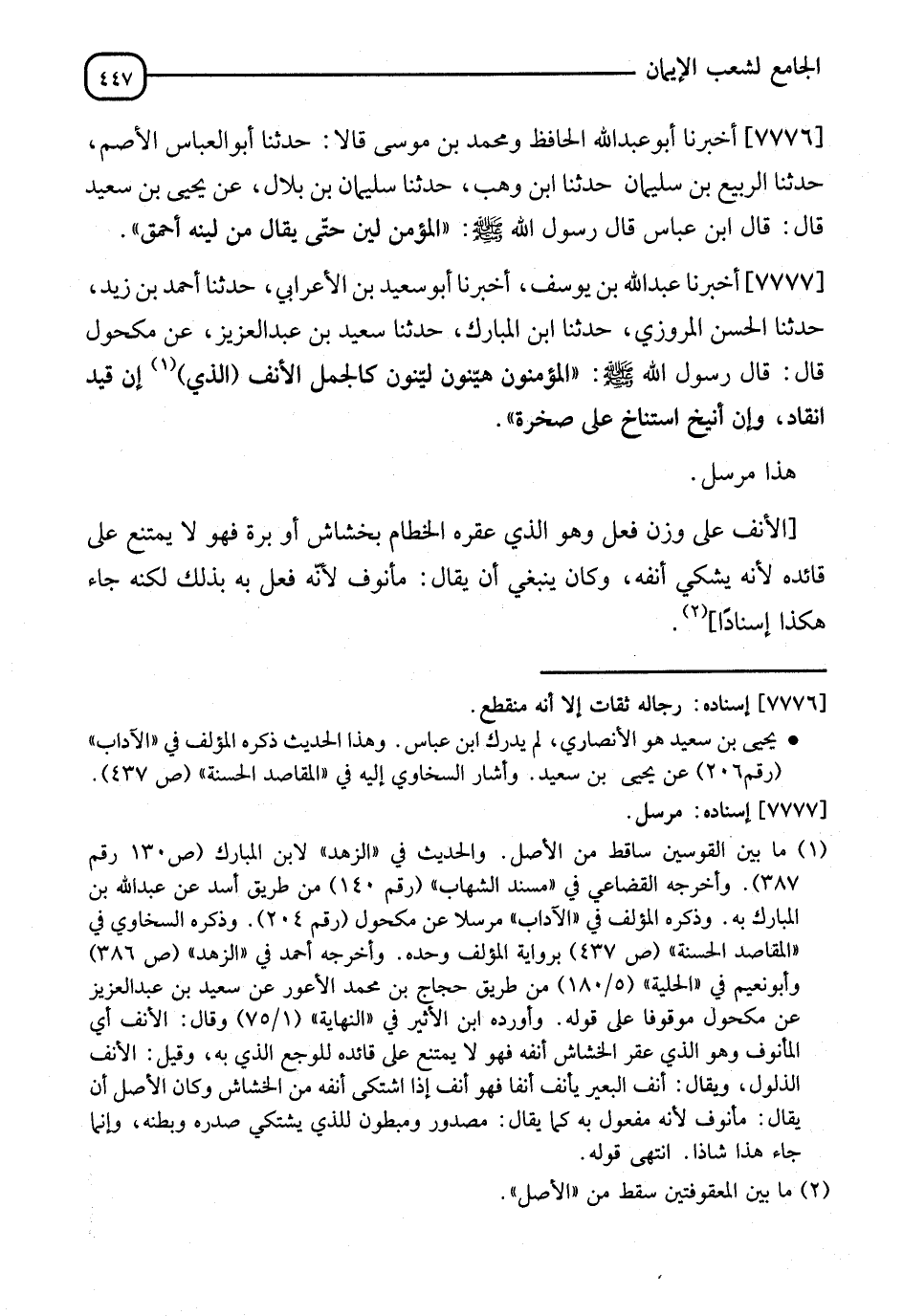 7777 - أَخْبَرَنَا عَبْدُ اللهِ بْنُ يُوسُفَ، أنا أَبُو سَعِيدِ بْنُ الْأَعْرَابِيِّ، نا أَحْمَدُ بْنُ زَيْدٍ، نا الْحُسَيْنُ الْمَرْوَزِيُّ، نا ابْنُ الْمُبَارَكِ، نا سَعِيدُ بْنُ عَبْدِ الْعَزِيزِ، عَنْ مَكْحُولٍ، قَالَ: قَالَ رَسُولُ اللهِ صَلَّى اللَّهُ عَلَيْهِ وَسَلَّمَ: " §الْمُؤْمِنُونَ هَيِّنُونَ لَيِّنُونَ كَالْجَمَلِ الْأَنِفِ، إِنْ قِيدَ انْقَادَ، وَإِنْ أُنِيخَ اسْتَنَاخَ عَلَى صَخْرَةٍ "