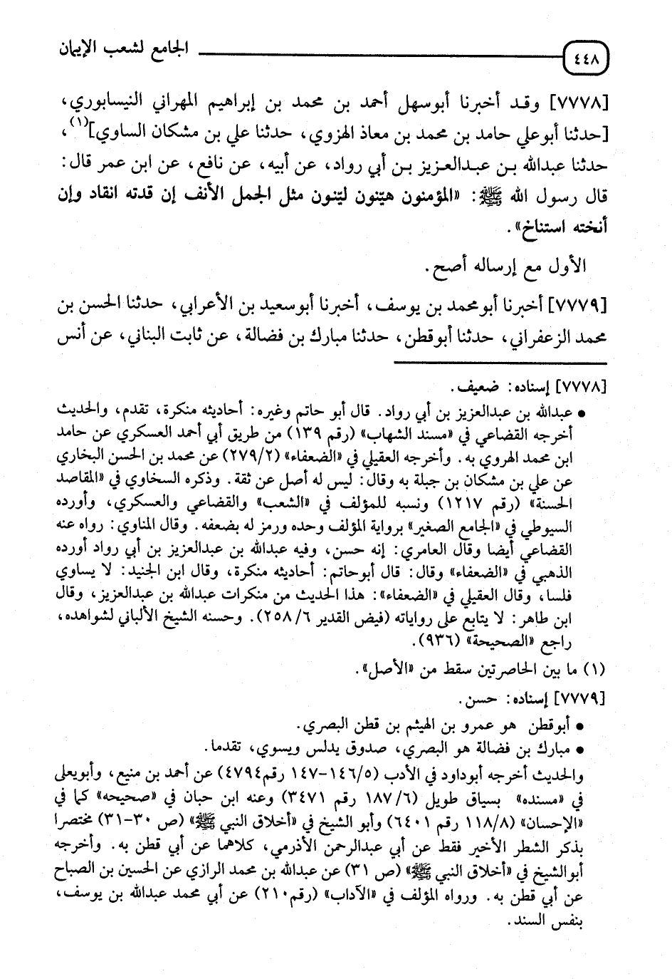 7778 - وَقَدْ أَخْبَرَنَا أَبُو سَهْلٍ أَحْمَدُ بْنُ مُحَمَّدِ بْنِ إِبْرَاهِيمَ الْهَرَّانِيُّ النَّيْسَابُورِيُّ، ثَنَا أَبُو عَلِيٍّ حَامِدُ بْنُ مُحَمَّدِ بْنِ مُعَاذٍ الْهَرَوِيُّ، ثَنَا عَلِيُّ بْنُ شَكَّانَ السَّاوِيُّ، نا عَبْدُ اللهِ بْنُ عَبْدِ الْعَزِيزِ بْنِ أَبِي رَوَّادٍ، عَنْ أَبِيهِ، عَنْ نَافِعٍ، عَنِ ابْنِ عُمَرَ، قَالَ: قَالَ رَسُولُ اللهِ صَلَّى اللَّهُ عَلَيْهِ وَسَلَّمَ: " §الْمُؤْمِنُونَ هَيِّنُونَ لَيِّنُونَ مِثْلُ الْجَمَلِ الْأَنِفِ، إِنْ قُدْتَهُ انْقَادَ، وَإِنْ أَنَخْتَهُ اسْتَنَاخَ " الْأَوَّلُ مَعَ إِرْسَالِهِ أَصَحُّ
