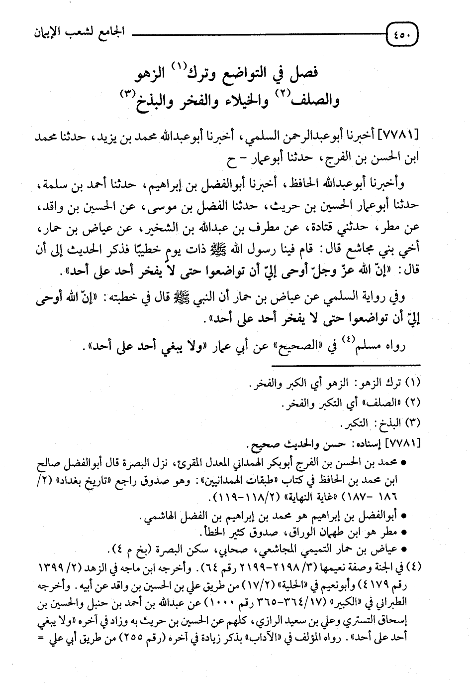 7781 - أَخْبَرَنَا أَبُو عَبْدِ الرَّحْمَنِ السُّلَمِيُّ، أنا أَبُو عَبْدِ اللهِ مُحَمَّدُ بْنُ يَزِيدَ، نا مُحَمَّدُ بْنُ الْحَسَنِ بْنِ الْفَرَجِ، نا أَبُو عَمَّارٍ، ح وَأَخْبَرَنَا أَبُو عَبْدِ اللهِ الْحَافِظُ، أنا أَبُو الْفَضْلِ بْنُ إِبْرَاهِيمَ، نا أَحْمَدُ بْنُ سَلَمَةَ، نا أَبُو عَمَّارٍ الْحُسَيْنُ بْنُ حُرَيْثٍ، ثَنَا الْفَضْلُ بْنُ مُوسَى، عَنِ الْحُسَيْنِ بْنِ وَاقِدٍ، عَنْ مَطَرٍ، حَدَّثَنِي قَتَادَةُ، عَنْ مُطَرِّفِ بْنِ عَبْدِ اللهِ بْنِ الشِّخِّيرِ، عَنْ عِيَاضِ بْنِ حِمَارٍ، أَخِي بَنِي مُجَاشِعٍ، قَالَ: قَامَ فِينَا رَسُولُ اللهِ صَلَّى اللَّهُ عَلَيْهِ وَسَلَّمَ ذَاتَ يَوْمٍ خَطِيبًا، فَذَكَرَ الْحَدِيثَ إِلَى أَنْ قَالَ: " إِنَّ §اللهَ عَزَّ وَجَلَّ أَوْحَى إِلَيَّ أَنْ تَوَاضَعُوا حَتَّى لَا يَفْخَرَ أَحَدٌ عَلَى أَحَدٍ " وَفِي رِوَايَةِ السُّلَمِيِّ، عَنْ عِيَاضِ بْنِ حِمَارٍ أَنَّ النَّبِيَّ صَلَّى اللَّهُ عَلَيْهِ وَسَلَّمَ قَالَ فِي خُطْبَتِهِ: " إِنَّ اللهَ عَزَّ وَجَلَّ أَوْحَى إِلَيَّ أَنْ تَوَاضَعُوا حَتَّى لَا يَفْخَرَ أَحَدٌ عَلَى أَحَدٍ " رَوَاهُ مُسْلِمٌ فِي الصَّحِيحِ، عَنْ أَبِي عَمَّارٍ: " وَلَا يَبْغِي أَحَدٌ عَلَى أَحَدٍ "