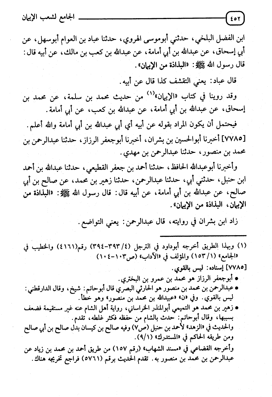 7785 - أَخْبَرَنَا أَبُو الْحُسَيْنِ بْنُ بِشْرَانَ، أنا أَبُو جَعْفَرٍ الرَّزَّازُ، نا عَبْدُ الرَّحْمَنِ بْنُ مُحَمَّدِ بْنِ مَنْصُورٍ، نا عَبْدُ الرَّحْمَنِ بْنُ مَهْدِيٍّ، وَأَخْبَرَنَا أَبُو عَبْدِ اللهِ الْحَافِظُ، نا أَحْمَدُ بْنُ جَعْفَرٍ الْقُطَيْعِيُّ، نا عَبْدُ اللهِ بْنُ أَحْمَدَ بْنِ حَنْبَلٍ، حَدَّثَنِي أَبِي، نا عَبْدُ الرَّحْمَنِ، نا زُهَيْرُ بْنُ مُحَمَّدٍ، عَنْ صَالِحِ بْنِ أَبِي صَالِحٍ، عَنْ عَبْدِ اللهِ بْنِ أَبِي أُمَامَةَ، عَنْ أَبِيهِ، قَالَ: قَالَ رَسُولُ اللهِ صَلَّى اللَّهُ عَلَيْهِ وَسَلَّمَ: " §الْبَذَاذَةُ مِنَ الْإِيمَانِ، الْبَذَاذَةُ مِنَ الْإِيمَانِ " زَادُ ابْنُ بِشْرَانَ فِي رِوَايَتِهِ: قَالَ عَبْدُ الرَّحْمَنِ: يَعْنِي التَّوَاضُعَ