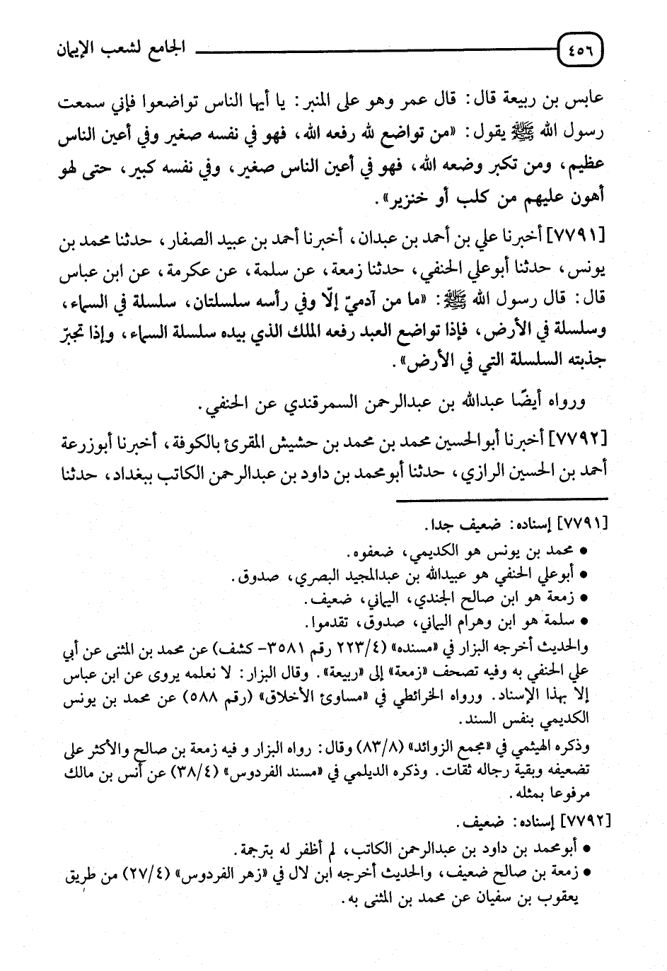 7791 - أَخْبَرَنَا عَلِيُّ بْنُ أَحْمَدَ بْنِ عَبْدَانَ، أنا أَحْمَدُ بْنُ عُبَيْدٍ الصَّفَّارُ، نا مُحَمَّدُ بْنُ يُونُسَ، نا أَبُو عَلِيٍّ الْحَنَفِيِّ زَمْعَةَ، عَنْ سَلَمَةَ، عَنْ عِكْرِمَةَ، عَنِ ابْنِ عَبَّاسٍ، قَالَ: قَالَ رَسُولُ اللهِ صَلَّى اللَّهُ عَلَيْهِ وَسَلَّمَ: " §مَا مِنْ آدَمِيٍّ إِلَّا فِي رَأْسِهِ سِلْسِلَتَانِ، سِلْسِلَةٌ فِي السَّمَاءِ، وَسِلْسِلَةٌ فِي الْأَرْضِ، فَإِذَا تَوَاضَعَ الْعَبْدُ رَفَعَهُ الْمَلَكُ الَّذِي بِيَدِهِ سِلْسِلَةٌ مِنَ السَّمَاءِ، وَإِذَا تَجَبَّرَ جَذْبَتْهُ السِّلْسِلَةُ الَّتِي فِي الْأَرْضِ " وَرَوَاهُ أَيْضًا عَبْدُ اللهِ بْنُ عَبْدِ الرَّحْمَنِ السَّمَرْقَنْدِيُّ، عَنِ الْحَنَفِيِّ
