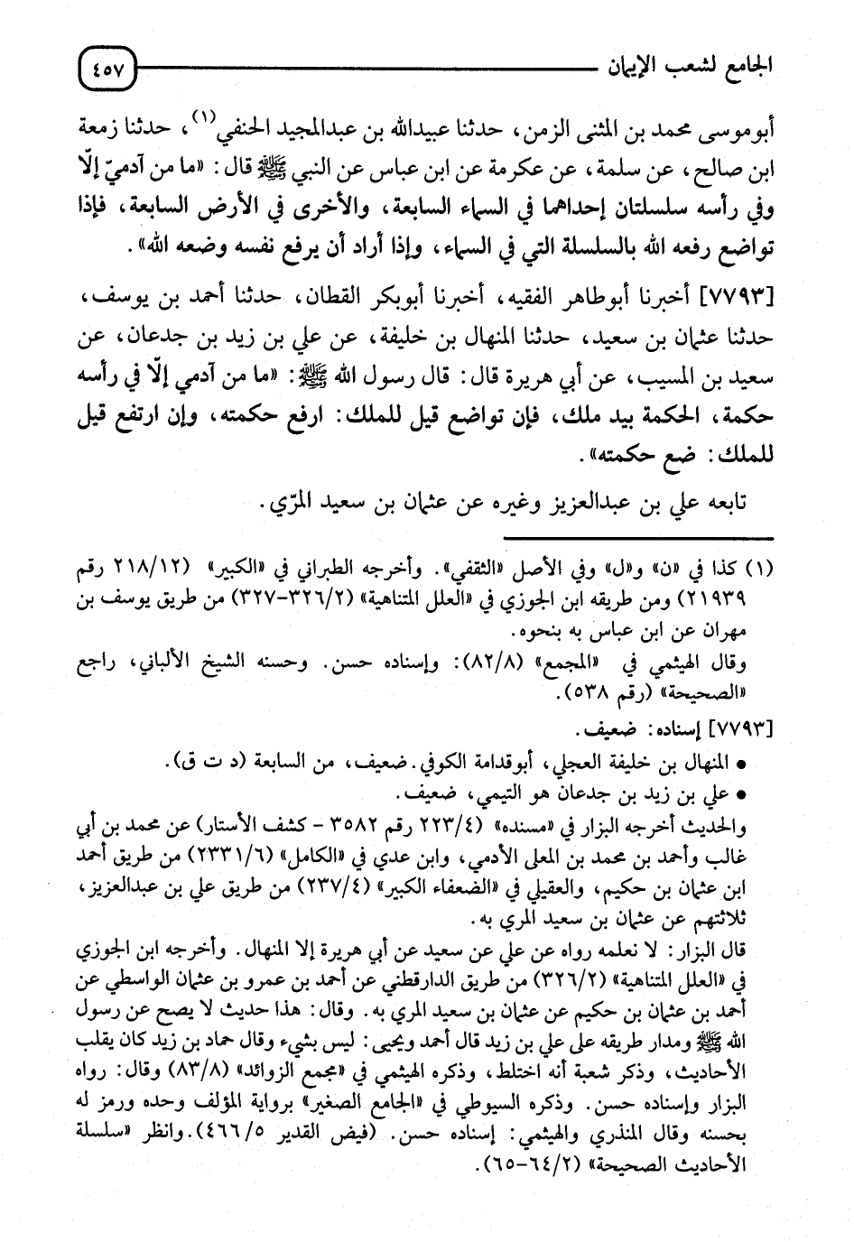 7793 - أَخْبَرَنَا أَبُو طَاهِرٍ الْفَقِيهُ، أنا أَبُو بَكْرٍ الْقَطَّانُ، نا أَحْمَدُ بْنُ يُوسُفَ، نا عُثْمَانُ بْنُ سَعِيدٍ، نا الْمِنْهَالُ بْنُ خَلِيفَةَ، عَنْ عَلِيِّ بْنِ زَيْدِ بْنِ جُدْعَانَ، عَنْ سَعِيدِ بْنِ الْمُسَيِّبِ، عَنْ أَبِي هُرَيْرَةَ، قَالَ: قَالَ رَسُولُ اللهِ صَلَّى اللَّهُ عَلَيْهِ وَسَلَّمَ: §" مَا مِنْ آدَمِيٍّ إِلَّا فِي رَأْسِهِ حَكَمَةُ الْحِكْمَةِ بِيَدِ مَلَكٍ، فَإِنْ تَوَاضَعَ قِيلَ لِلْمَلَكِ: ارْفَعْ حِكْمَتَهُ، وَإِنِ ارْتَفَعَ قِيلَ لِلْمَلَكِ: ضَعْ حِكْمَتَهُ " تَابَعَهُ عَلِيُّ بْنُ عَبْدِ الْعَزِيزِ، وَغَيْرُهُ عَنْ عُثْمَانَ بْنِ سَعِيدٍ الْمُرِّيُّ