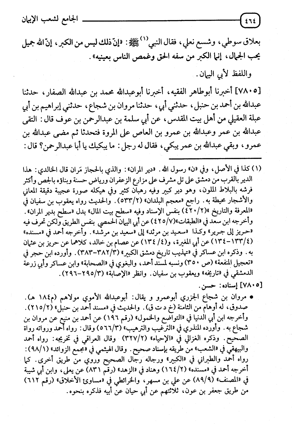 7805 - أَخْبَرَنَا أَبُو طَاهِرٍ الْفَقِيهُ، أنا أَبُو عَبْدِ اللهِ مُحَمَّدُ بْنُ عَبْدِ اللهِ الصَّفَّارُ، نا عَبْدُ اللهِ بْنُ أَحْمَدَ بْنِ حَنْبَلٍ، حَدَّثَنِي أَبِي، نا مَرْوَانُ بْنُ شُجَاعٍ، حَدَّثَنِي إِبْرَاهِيمُ بْنُ أَبِي عَبْلَةَ الْعُقَيْلِيُّ، مِنْ أَهْلِ بَيْتِ الْمَقْدِسِ، عَنْ أَبِي سَلَمَةَ بْنِ عَبْدِ الرَّحْمَنِ بْنِ عَوْفٍ، قَالَ: الْتَقَى عَبْدُ اللهِ بْنُ عُمَرَ، وعَبْدُ اللهِ بْنُ عَمْرِو بْنِ الْعَاصِ عَلَى الْمَرْوَةِ، فَتَحَدَّثَا ثُمَّ مَضَى عَبْدُ اللهِ بْنُ عَمْرٍو، وَبَقِيَ عَبْدُ اللهِ بْنُ عُمَرَ يَبْكِي، فَقَالَ لَهُ رَجُلٌ: مَا يُبْكِيكَ يَا أَبَا عَبْدِ الرَّحْمَنِ؟ قَالَ: -[465]- هَذَا يَعْنِي عَبْدَ اللهِ بْنَ عَمْرٍو، إِنَّهُ سَمِعَ رَسُولَ اللهِ صَلَّى اللَّهُ عَلَيْهِ وَسَلَّمَ يَقُولُ: §" مَنْ كَانَ فِي قَلْبِهِ مِثْقَالُ حَبَّةٍ مِنْ خَرْدَلٍ مِنْ كِبْرٍ كَبَّهُ اللهُ عَزَّ وَجَلَّ عَلَى وَجْهِهِ فِي النَّارِ "