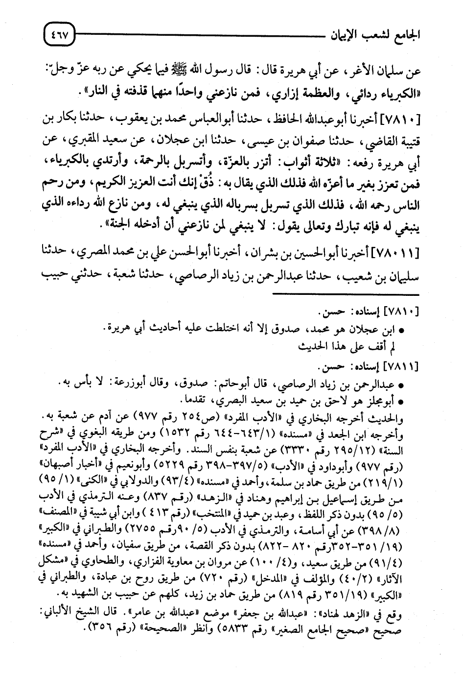 7810 - أَخْبَرَنَا أَبُو عَبْدِ اللهِ الْحَافِظُ، نا أَبُو الْعَبَّاسِ مُحَمَّدُ بْنُ يَعْقُوبَ، نا بَكَّارُ بْنُ قُتَيْبَةَ الْقَاضِي، نا صَفْوَانُ بْنُ عِيسَى، نا ابْنُ عَجْلَانَ، عَنْ سَعِيدٍ الْمَقْبُرِيِّ، عَنْ أَبِي هُرَيْرَةَ، رَفَعَهُ: " ثَلَاثَةُ أَثْوَابٍ أَتَّزِرُ بِالْعِزَّةِ، وَأَتَسَرْبَلُ بِالرَّحْمَةِ، وَأَرْتَدِي بِالْكِبْرِيَاءِ، فَمَنْ تَعَزَّزَ بِغَيْرِ مَا أَعَزَّهُ اللهُ فَذَلِكَ الَّذِي يُقَالُ لَهُ: ذُقْ إِنَّكَ أَنْتَ الْعَزِيزُ الْكَرِيمُ، وَمَنْ رَحِمَ النَّاسُ رَحِمَهُ اللهُ، فَذَلِكَ الَّذِي تَسَرْبَلَ بِسِرْبَالِهِ الَّذِي يَنْبَغِي لَهُ، وَمَنْ نَازَعَ اللهَ رِدَاءَهُ الَّذِي يَنْبَغِي لَهُ، فَإِنَّهُ تَبَارَكَ وَتَعَالَى يَقُولُ: §لَا يَنْبَغِي لِمَنْ نَازَعَنِي أَنْ أُدْخِلَهُ الْجَنَّةَ "