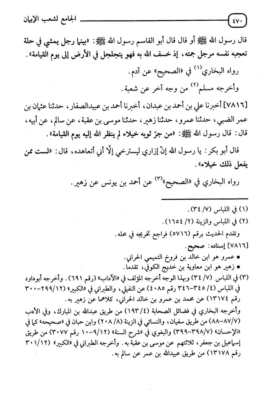 7816 - أَخْبَرَنَا عَلِيُّ بْنُ أَحْمَدَ بْنِ عَبْدَانَ، أنا أَحْمَدُ بْنُ عُبَيْدٍ الصَّفَّارُ، نا عُثْمَانُ بْنُ عُمَرَ الضَّبِّيُّ، نا عَمْرٌو، نا زُهَيْرٌ، نا مُوسَى بْنُ عُقْبَةَ، عَنْ سَالِمٍ، عَنْ أَبِيهِ، قَالَ: قَالَ رَسُولُ اللهِ صَلَّى الله عَلَيْهِ وَسلَّمَ: §" مَنْ جَرَّ ثَوْبَهُ خُيَلَاءَ لَمْ يَنْظُرِ اللهُ إِلَيْهِ يَوْمَ الْقِيَامَةِ "، قَالَ أَبُو بَكْرٍ: يَا رَسُولَ اللهِ، إِنَّ إِزَارِي لَيَسْتَرْخِي إِلَّا أَنْ أَتَعَاهَدَهُ، قَالَ: " لَسْتَ مِمَّنْ يَفْعَلُ ذَلِكَ خُيَلَاءَ " رَوَاهُ الْبُخَارِيُّ فِي الصَّحِيحِ، عَنْ أَحْمَدَ بْنِ يُونُسَ، عَنْ زُهَيْرٍ