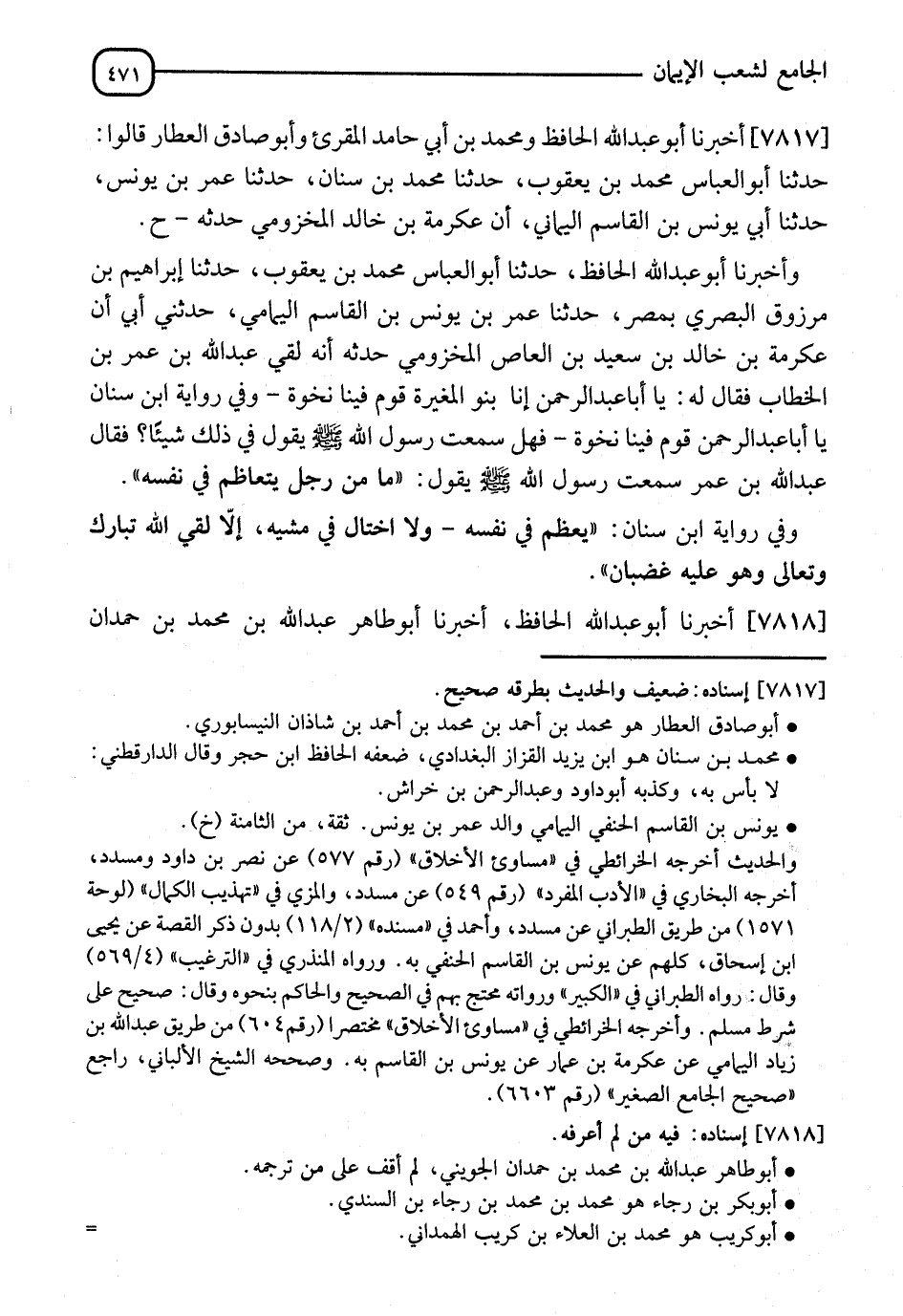 7817 - أَخْبَرَنَا أَبُو عَبْدِ اللهِ الْحَافِظُ، وَأَبُو مُحَمَّدِ بْنُ أَبِي حَامِدٍ الْمُقْرِئُ، وَأَبُو صَادِقٍ الْعَطَّارُ، نا أَبُو الْعَبَّاسِ مُحَمَّدُ بْنُ يَعْقُوبَ، نا مُحَمَّدُ بْنُ سِنَانٍ، نا عُمَرُ بْنُ يُونُسَ، نا أَبِي يُونُسُ بْنُ الْقَاسِمِ الْيَمَامِيُّ، أَنَّ عِكْرِمَةَ بْنَ خَالِدٍ الْمَخْزُومِيَّ حَدَّثَهُ، ح وَأَخْبَرَنَا أَبُو عَبْدِ اللهِ الْحَافِظُ، نا أَبُو الْعَبَّاسِ مُحَمَّدُ بْنُ يَعْقُوبَ، نا إِبْرَاهِيمُ بْنُ مَرْزُوقٍ الْبَصْرِيُّ، بِمِصْرَ، نا عُمَرُ بْنُ يُونُسَ بْنِ الْقَاسِمِ الْيَمَامِيُّ، حَدَّثَنِي أَبِي، أَنَّ عِكْرِمَةَ بْنَ خَالِدِ بْنِ سَعِيدِ بْنِ الْعَاصِ الْمَخْزُومِيَّ حَدَّثَهُ، أَنَّهُ لَقِيَ عَبْدَ اللهِ بْنَ عُمَرَ بْنِ الْخَطَّابِ، فَقَالَ لَهُ: يَا أَبَا عَبْدِ الرَّحْمَنِ، إِنَّا بَنُو الْمُغِيرَةِ قَوْمٌ فِينَا نَخْوَةٌ، وَفِي رِوَايَةِ ابْنِ سِنَانٍ: يَا أَبَا عَبْدِ الرَّحْمَنِ، إِنَّا قَوْمٌ فِينَا نَخْوَةٌ، فَهَلْ سَمِعْتَ رَسُولَ اللهِ صَلَّى الله عَلَيْهِ وَسلَّمَ يَقُولُ فِي ذَلِكَ شَيْئًا؟ فَقَالَ عَبْدُ اللهِ بْنُ عُمَرَ: سَمِعْتُ رَسُولَ اللهِ صَلَّى الله عَلَيْهِ وَسلَّمَ، يَقُولُ: §" مَا مِنْ رَجُلٍ يَتَعَاظَمُ فِي نَفْسِهِ - وَفِي رِوَايَةِ ابْنِ سِنَانٍ: يَسْتَعْظِمُ فِي نَفْسِهِ - وَلَا اخْتَالَ فِي مَشْيِهِ إِلَّا لَقِيَ اللهَ تَبَارَكَ وَتَعَالَى وَهُوَ عَلَيْهِ غَضْبَانُ "