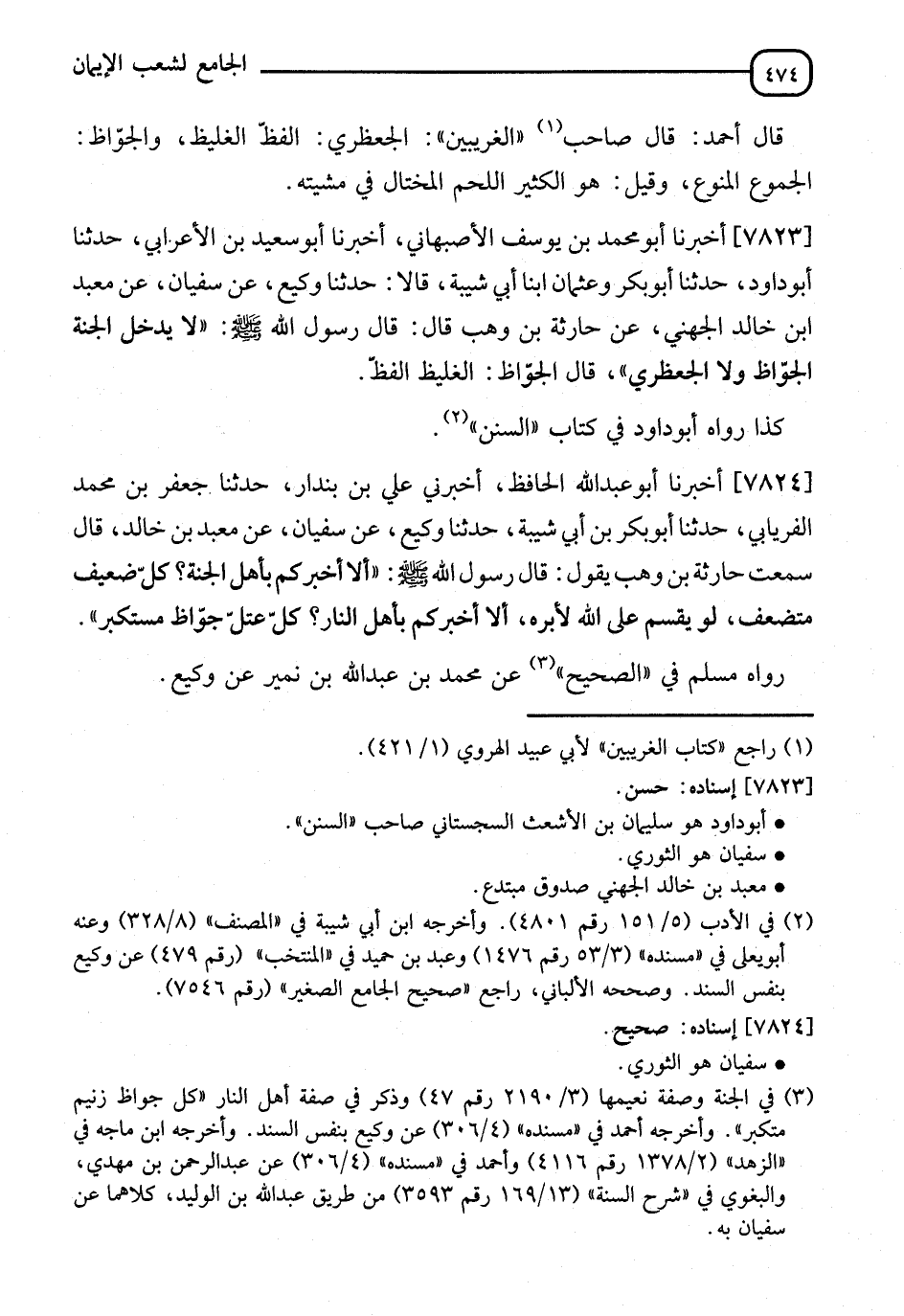 7823 - أَخْبَرَنَا أَبُو مُحَمَّدِ بْنُ يُوسُفَ الْأَصْبَهَانِيُّ، أنا أَبُو سَعِيدِ بْنُ الْأَعْرَابِيِّ، نا أَبُو دَاوُدَ، نا أَبُو بَكْرٍ، وَعُثْمَانُ ابْنَا أَبِي شَيْبَةَ، قَالَا: نا وَكِيعٌ، عَنْ سُفْيَانَ، عَنْ مَعْبَدِ بْنِ خَالِدٍ الْجُهَنِيِّ، عَنْ حَارِثَةَ بْنِ وَهْبٍ، قَالَ: قَالَ رَسُولُ اللهِ صَلَّى الله عَلَيْهِ وَسلَّمَ: " §لَا يَدْخُلُ الْجَنَّةَ الْجَوَّاظُ وَلَا الْجَعْظَرِيُّ "، قَالَ: " وَالْجَوَّاظُ: الْغَلِيظُ الْفَظُّ كَذَا رَوَاهُ أَبُو دَاوُدَ فِي كِتَابِ السُّنَنِ "
