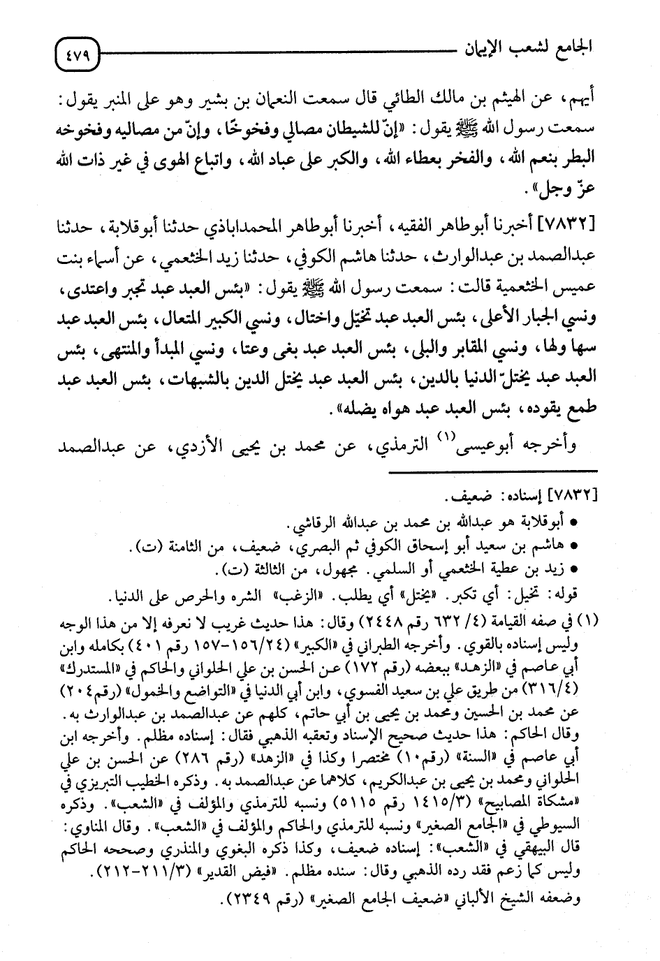 7832 - أَخْبَرَنَا أَبُو طَاهِرٍ الْفَقِيهُ، أنا أَبُو طَاهِرٍ الْمُحَمَّدْ آبَادِيُّ، نا أَبُو قِلَابَةَ، نا عَبْدُ الصَّمَدِ بْنُ عَبْدِ الْوَارِثِ، نا هَاشِمٌ الْكُوفِيُّ، نا زَيْدٌ الْخَثْعَمِيُّ، عَنْ أَسْمَاءَ بِنْتِ عُمَيْسٍ الْخَثْعَمِيَّةِ، قَالَتْ: سَمِعْتُ رَسُولَ اللهِ صَلَّى الله عَلَيْهِ وَسلَّمَ يَقُولُ: " §بِئْسَ الْعَبْدُ عَبْدٌ تَجَبَّرَ وَاعْتَدَى، وَنَسِيَ الْجَبَّارَ الْأَعْلَى، بِئْسَ الْعَبْدُ عَبْدٌ تَحَيَّلَ وَاخْتَالَ، وَنَسِيَ الْكَبِيرَ الْمُتَعَالَ، بِئْسَ الْعَبْدُ عَبْدٌ سَهَا وَلَهَا، نَسِيَ الْمَقَابِرَ وَالْبِلَى، بِئْسَ الْعَبْدُ عَبْدٌ بَغَى وَعَتَا، وَنَسِيَ الْمَبْدَأَ وَالْمُنْتَهَى، بِئْسَ الْعَبْدُ عَبْدٌ يَخْتِلُ الدُّنْيَا بِالدِّينِ، بِئْسَ الْعَبْدُ عَبْدٌ يَخْتِلُ الدِّينَ بِالشُّبُهَاتِ، بِئْسَ الْعَبْدُ عَبْدٌ طَمَعٌ يَقُودُهُ، بِئْسَ الْعَبْدُ عَبْدٌ هَوًى يُضِلُّهُ " أَخْرَجَهُ أَبُو عِيسَى التِّرْمِذِيُّ، عَنْ مُحَمَّدِ بْنِ يَحْيَى الْأَزْدِيِّ، عَنْ عَبْدِ الصَّمَدِ، -[480]- وَقَالَ هَاشِمٌ هُوَ ابْنُ سَعِيدٍ الْكُوفِيُّ، وَزَادَ فِيهِ: " بِئْسَ الْعَبْدُ عَبْدٌ رَغَبٌ يُذِلُّهُ " " وَإِسْنَادُهُ لَيْسَ بِالْقَوِيِّ، وَرُوِيَ ذَلِكَ بِإِسْنَادٍ آخَرَ ضَعِيفٍ "