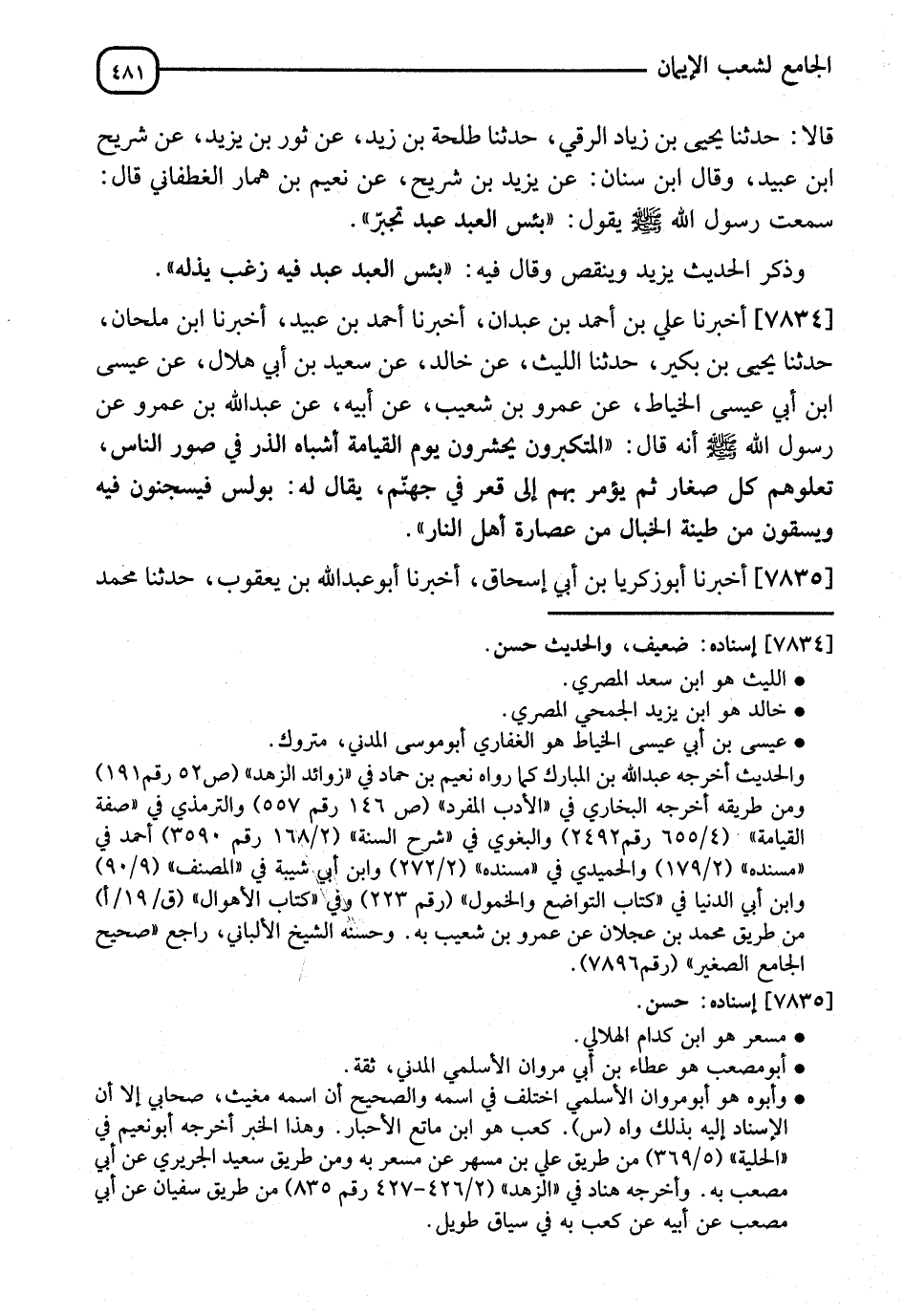 7834 - أَخْبَرَنَا عَلِيُّ بْنُ أَحْمَدَ بْنِ عَبْدَانَ، أنا أَحْمَدُ بْنُ عُبَيْدٍ، أنا ابْنُ مِلْحَانَ، نا يَحْيَى بْنُ بُكَيْرٍ، نا اللَّيْثُ، عَنْ خَالِدٍ، عَنْ سَعِيدِ بْنِ أَبِي هِلَالٍ، عَنْ عِيسَى بْنِ أَبِي عِيسَى الْخَيَّاطِ، عَنْ عَمْرِو بْنِ شُعَيْبٍ، عَنْ أَبِيهِ، عَنْ عَبْدِ اللهِ بْنِ عَمْرٍو، عَنْ رَسُولِ اللهِ صَلَّى الله عَلَيْهِ وَسلَّمَ أَنَّهُ قَالَ: " §الْمُتَكَبِّرُونَ يُحْشَرُونَ يَوْمَ الْقِيَامَةِ أَشْبَاهَ الذَّرِّ فِي صُوَرِ النَّاسِ، يَعْلُوهُمْ كُلُّ صَغَارٍ، ثُمَّ يُؤْمَرُ بِهِمْ إِلَى قَصْرٍ فِي جَهَنَّمَ يُقَالُ لَهُ: بُولَسَ، فَيُسْحَبُونَ فِيهِ وَيُسْقَونَ مِنْ طِينَةِ الْخَبَالِ، مِنْ عُصَارَةِ أَهْلِ النَّارِ "