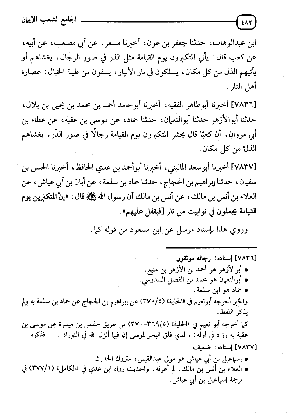 7837 - أَخْبَرَنَا أَبُو سَعْدٍ الْمَالِينِيُّ، أنا أَبُو أَحْمَدَ بْنُ عَدِيٍّ الْحَافِظُ، أنا الْحَسَنُ بْنُ سُفْيَانَ، نا إِبْرَاهِيمُ بْنُ الْحَجَّاجِ، نا حَمَّادُ بْنُ سَلَمَةَ، عَنْ أَبَانَ بْنِ أَبِي عَيَّاشٍ، عَنِ الْعَلَاءِ بْنِ أَنَسِ بْنِ مَالِكٍ، عَنْ أَنَسِ بْنِ مَالِكٍ، أَنَّ رَسُولَ اللهِ صَلَّى الله عَلَيْهِ وَسلَّمَ، قَالَ: §" إِنَّ الْمُتَكَبِّرِينَ يَوْمَ الْقِيَامَةِ يُجْعَلُونَ فِي تَوَابِيتَ مِنْ نَارٍ يُنْتَقَلُ عَلَيْهِمْ " وَرُوِيَ هَذَا بِإِسْنَادٍ مُرْسَلٍ، عَنِ ابْنِ مَسْعُودٍ مِنْ قَوْلِهِ