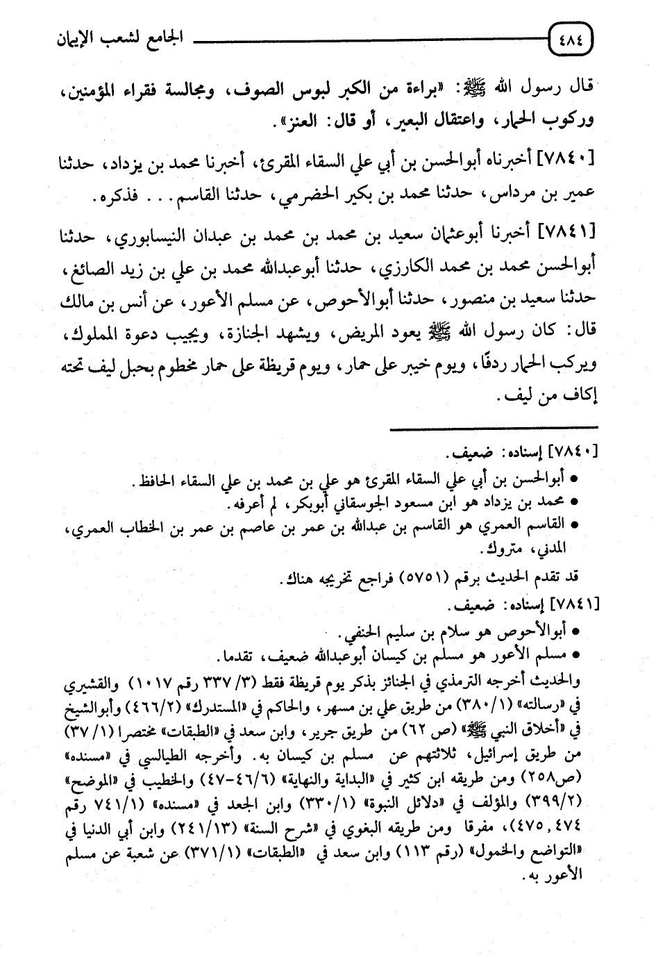 7841 - أَخْبَرَنَا أَبُو عُثْمَانَ سَعِيدُ بْنُ مُحَمَّدِ بْنِ مُحَمَّدِ بْنِ عَبْدَانَ النَّيْسَابُورِيُّ، نا أَبُو الْحَسَنِ مُحَمَّدُ بْنُ مُحَمَّدٍ الْكَازِرِيُّ، نا أَبُو عَبْدِ اللهِ مُحَمَّدُ بْنُ عَلِيِّ بْنِ زَيْدٍ الصَّائِغُ، نا سَعِيدُ بْنُ مَنْصُورٍ، نا أَبُو الْأَحْوَصِ، عَنْ مُسْلِمٍ الْأَعْوَرِ، عَنْ أَنَسِ بْنِ مَالِكٍ، قَالَ: " كَانَ رَسُولُ اللهِ صَلَّى الله عَلَيْهِ وَسلَّمَ §يَعُودُ الْمَرِيضَ، وَيَشْهَدُ الْجَنَازَةَ، وَيُجِيبُ دَعْوَةَ الْمَمْلُوكِ، وَيَرْكَبُ الْحِمَارَ رِدْفًا، وَكَانَ يَوْمَ خَيْبَرَ عَلَى حِمَارٍ، وَيَوْمَ قُرَيْظَةَ عَلَى حِمَارٍ مَخْطُومٍ بِحَبْلِ لِيفٍ تَحْتَهُ إِكَافٌ مِنْ لِيفٍ "