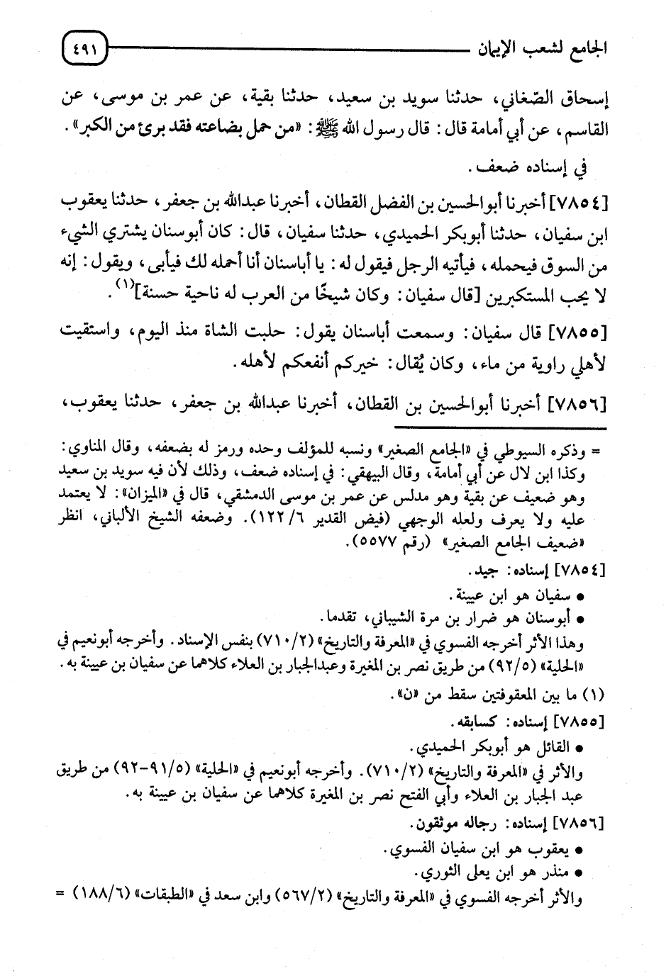 7854 - أَخْبَرَنَا أَبُو الْحُسَيْنِ بْنُ الْفَضْلِ الْقَطَّانُ، أنا عَبْدُ اللهِ بْنُ جَعْفَرٍ، نا يَعْقُوبُ بْنُ سُفْيَانَ، نا أَبُو بَكْرٍ الْحُمَيْدِيُّ، نا سُفْيَانُ، قَالَ: كَانَ أَبُو سِنَانٍ يَشْتَرِي الشَّيْءَ مِنَ السُّوقِ فَيَحْمِلُهُ، فَيَأْتِيهِ الرَّجُلُ، فَيَقُولُ لَهُ: يَا أَبَا سِنَانٍ، أَنَا أَحْمِلُهُ لَكَ، فَيَأْبَى، وَيَقُولُ: §" إِنَّهُ لَا يُحِبُّ الْمُسْتَكْبِرِينَ "