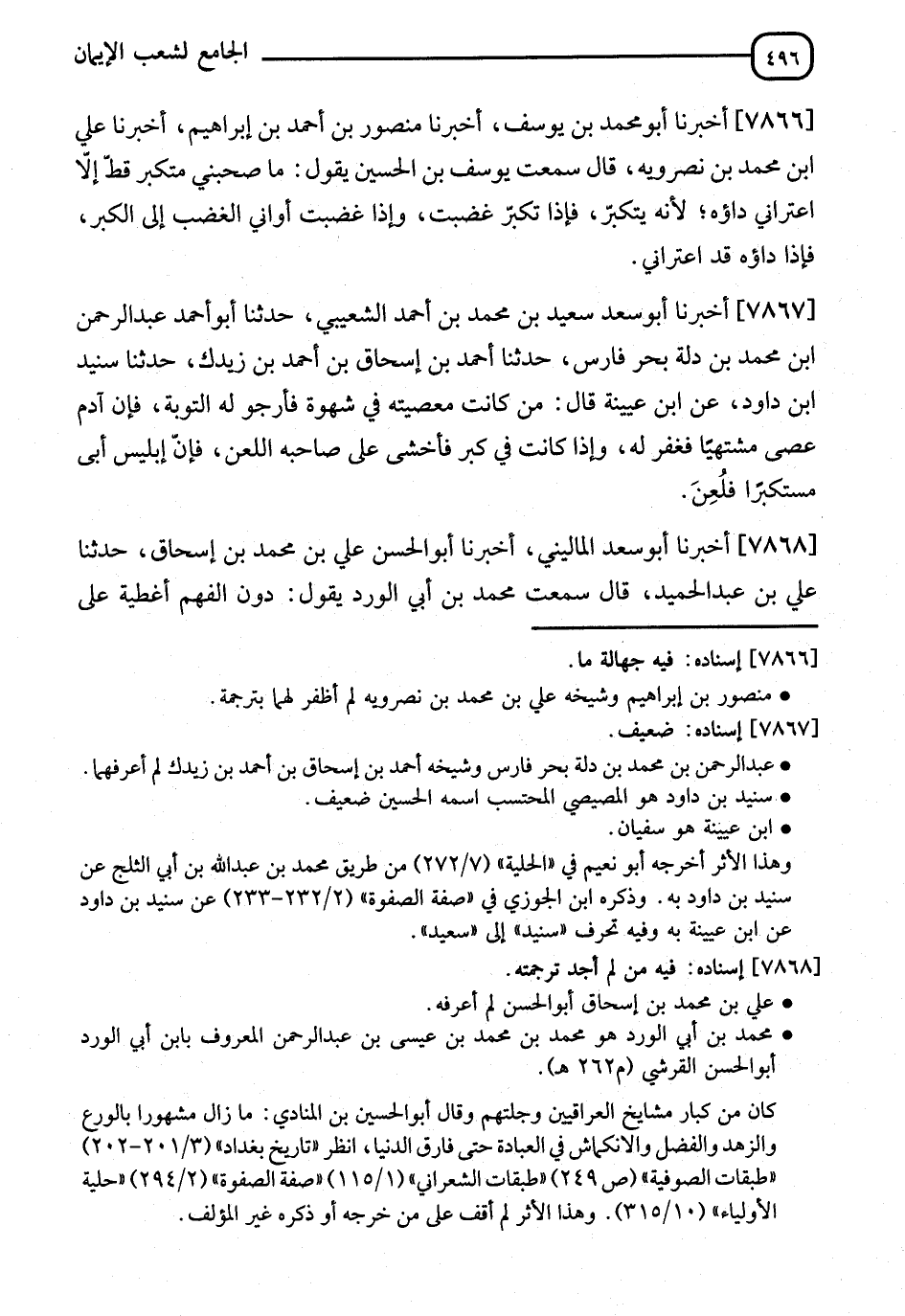 7866 - أَخْبَرَنَا أَبُو مُحَمَّدِ بْنُ يُوسُفَ، أنا مَنْصُورُ بْنُ مُحَمَّدِ بْنِ إِبْرَاهِيمَ، أنا عَلِيُّ بْنُ مُحَمَّدِ بْنِ نَصْرَوَيْهِ، قَالَ: سَمِعْتُ يُوسُفَ بْنَ الْحُسَيْنِ، يَقُولُ: " §مَا صَحِبَنِي مُتَكَبِّرٌ قَطُّ إِلَّا اعْتَرَانِي دَاؤُهُ، لِأَنَّهُ يَتَكَبَّرُ، فَإِذَا تَكَبَّرَ غَضِبْتُ، فَإِذَا غَضِبْتُ أدَّانِي الْغَضَبُ إِلَى الْكِبْرِ، فَإِذَا دَاؤُهُ قَدِ اعْتَرَانِي "