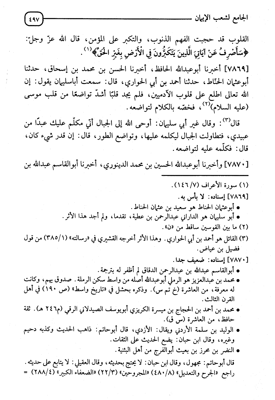 7869 - أَخْبَرَنَا أَبُو عَبْدِ اللهِ الْحَافِظُ، أنا الْحَسَنُ بْنُ مُحَمَّدِ بْنِ إِسْحَاقَ، أنا أَبُو عُثْمَانَ الْخَيَّاطُ، نا أَحْمَدُ بْنُ أَبِي الْحَوَارِيِّ، قَالَ: سَمِعْتُ أَبَا سُلَيْمَانَ، يَقُولُ: " إِنَّ §اللهَ تَعَالَى اطَّلَعَ عَلَى قُلُوبِ الْآدَمِيِّينَ، فَلَمْ يَجِدْ قَلْبًا أَشَدَّ تَوَاضُعًا مِنْ قَلْبِ مُوسَى عَلَيْهِ السَّلَامُ، فَخَصَّهُ بِالْكَلَامِ لِتَوَاضُعِهِ " قَالَ: وَقَالَ غَيْرُ أَبِي سُلَيْمَانَ: " أَوْحَى اللهُ إِلَى الْجِبَالِ أَنِّي مُكَلِّمٌ عَلَيْكِ عَبْدًا مِنْ عَبِيدِي، فَتَطَاوَلَتِ الْجِبَالُ لِيُكَلِّمَهُ عَلَيْهَا. وَتَوَاضَعُ الطُّورُ، قَالَ: إِنْ قُدِّرَ شَيْءٌ كَانَ، قَالَ: وَكَلَّمَهُ عَلَيْهِ لِتَوَاضُعِهِ "