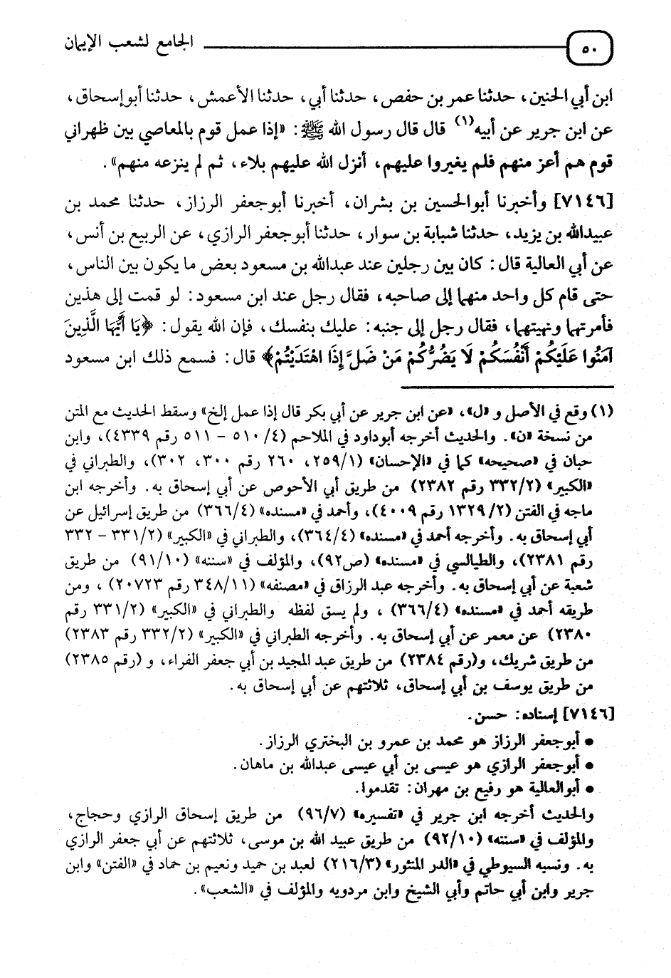 7146 - وَأَخْبَرَنَا أَبُو الْحُسَيْنِ بْنُ بِشْرَانَ، أنا أَبُو جَعْفَرٍ الرَّزَّازُ، نا مُحَمَّدُ بْنُ عُبَيْدِ اللهِ بْنِ يَزِيدَ، نا شَبَابَةُ بْنُ سَوَّارٍ، نا أَبُو جَعْفَرٍ الرَّازِيُّ، عَنِ الرَّبِيعِ بْنِ أَنَسٍ، عَنْ أَبِي الْعَالِيَةَ، قَالَ: كَانَ بَيْنَ رَجُلَيْنِ عِنْدَ عَبْدِ اللهِ بْنِ مَسْعُودٍ بَعْضُ مَا يَكُونُ بَيْنَ النَّاسِ حَتَّى قَامَ كُلُّ وَاحِدٍ مِنْهُمَا إِلَى صَاحِبِهِ، قَالَ: فَقَالَ رَجُلٌ عِنْدَ ابْنِ مَسْعُودٍ: لَوْ قُمْتَ إِلَى هَذَيْنِ فَأَمَرْتَهُمَا، أَوْ نَهَيْتَهُمَا، فَقَالَ رَجُلٌ إِلَى جَنْبِهِ: عَلَيْكَ بِنَفْسِكَ، فَإِنَّ اللهَ يَقُولُ: {يَا أَيُّهَا الَّذِينَ آمَنُوا عَلَيْكُمْ أَنْفُسَكُمْ لَا يَضُرُّكُمْ مَنْ ضَلَّ إِذَا اهْتَدَيْتُمْ} [المائدة: 105] قَالَ: فَسَمِعَ ذَلِكَ ابْنُ مَسْعُودٍ، -[51]- وَقَالَ: " لَمْ تجىءْ بِتَأْوِيلِ هَذِهِ الْآيَةِ بَعْدُ، إِنَّ §الْقُرْآنَ نَزَلَ عَلَى النَّبِيِّ صَلَّى اللَّهُ عَلَيْهِ وَسَلَّمَ وَمِنْهُ آيٌ مَضَى تَأْوِيلُهُنَّ - يَعْنِي قَبْلَ أَنْ يَنْزِلَ - وَمِنْهُ آيٌ وَقَعَ تَأْوِيلُهُنَّ عَلَى عَهْدِ رَسُولِ اللهِ صَلَّى اللَّهُ عَلَيْهِ وَسَلَّمَ، وَمِنْهُ آيٌ وَقَعَ تَأْوِيلُهُنَّ بَعْدَ النَّبِيِّ صَلَّى اللَّهُ عَلَيْهِ وَسَلَّمَ بِسِنِينَ، وَمِنْهُ آيٌ يَقَعُ تَأْوِيلُهُنَّ - يَعْنِي بَعْدَ الْيَوْمِ - وَمِنْهُ آيٌ يَقَعُ تَأْوِيلُهُنَّ عِنْدَ السَّاعَةِ، وَمَا ذُكِرَ عِنْدَ السَّاعَةِ، وَمِنْهُ آيٌ يَقَعُ تَأْوِيلُهُنَّ يَوْمَ الْقِيَامَةِ وَالْجَنَّةِ، وَالنَّارِ، وَالْحِسَابِ، وَالْمِيزَانِ، مَا دَامَتْ قُلُوبُكُمْ وَاحِدَةً وَأَهْوَاؤُكُمْ وَاحِدَةً، لَمْ يَلْبِسْكُمْ شِيَعًا وَيُذِيقَ بَعْضَكُمْ بَأْسَ بَعْضٍ، فَأْمُرُوا وَانْهَوْا، فَإِذَا اخْتَلَفَتْ قُلُوبُكُمْ وَأَهْوَاؤُكُمْ وَأَلْبَسَكُمْ شِيَعًا وَأَذَاقَ بَعْضَكُمْ بَأْسَ بَعْضٍ بَعْدَ ذَلِكَ جَاءَ تَأْوِيلُ هَذِهِ الْآيَةِ، فَامْرُؤٌ ونَفْسُهُ "