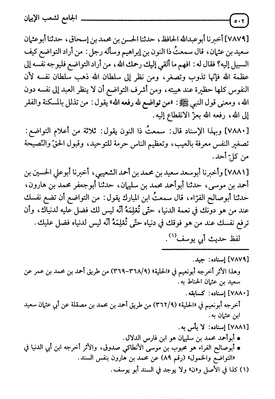 7881 - وَأَخْبَرَنَا أَبُو سَعْدٍ سَعِيدُ بْنُ مُحَمَّدِ بْنِ أَحْمَدَ الشَّعْيتِيُّ، أنا أَبُو عَلِيٍّ الْحُسَيْنُ بْنُ أَحْمَدَ بْنِ مُوسَى، نا أَبُو أَحْمَدَ مُحَمَّدُ بْنُ سُلَيْمَانَ، نا أَبُو جَعْفَرٍ مُحَمَّدُ بْنُ هَارُونَ، نا أَبُو صَالِحٍ الْفَرَّاءُ، قَالَ: سَمِعْتُ ابْنَ الْمُبَارَكِ، يَقُولُ: " مِنَ §التَّوَاضُعِ أَنْ تَقْمَعَ نَفْسَكَ عِنْدَ مَنْ هُوَ دُونَكَ فِي نِعْمَةِ الدُّنْيَا حَتَّى تُعْلِمَهُ أَنَّهُ لَيْسَ لَكَ فَضْلٌ عَلَيْهِ لِدُنْيَاكَ، وَأَنْ تَرْفَعَ نَفْسَكَ عِنْدَ مَنْ هُوَ فَوْقَكَ فِي دُنْيَاهُ حَتَّى تُعْلِمَهُ أَنَّهُ لَيْسَ لِدُنْيَاهُ فَضْلٌ عَلَيْكَ " لَفْظُ حَدِيثِ أَبِي يُوسُفَ