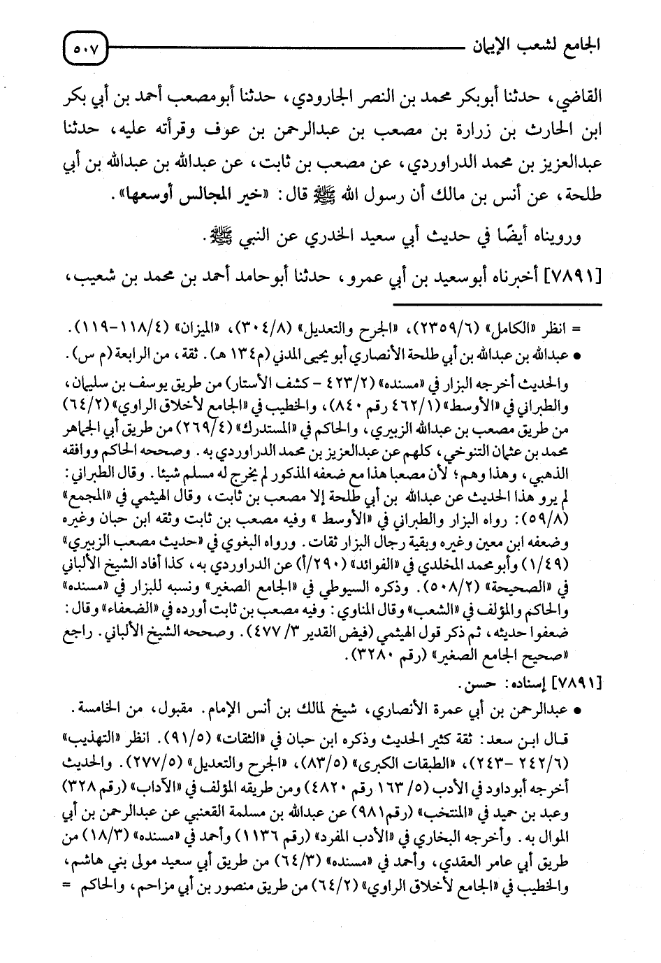 7891 - أَخْبَرَنَا أَبُو سَعْدِ بْنُ أَبِي عَمْرٍو، نا أَبُو حَامِدٍ أَحْمَدُ بْنُ مُحَمَّدِ بْنِ شُعَيْبٍ، -[508]- نا سَهْلُ بْنُ عَمَّارٍ الْعَتَكِيُّ، نا عَبْدُ الْمَلِكِ بْنُ إِبْرَاهِيمَ، أَخْبَرَنِي عَبْدُ الرَّحْمَنِ بْنُ أَبِي الْمَوَالِ، قَالَ: سَمِعْتُ عَبْدَ الرَّحْمَنِ بْنَ أَبِي عَمْرَةَ، قَالَ: أَذِنَ أَبُو سَعِيدٍ فِي قَوْمِهِ، فَلَمْ يَأْتِ حَتَّى أَخَذَ النَّاسُ مَجَالِسَهُمْ، فَلَمَّا أَنْ جَاءَ قَامَ لَهُ رَجُلٌ مِنْ مَجْلِسِهِ، فَقَالَ أَبُو سَعِيدٍ: سَمِعْتُ رَسُولَ اللهِ صَلَّى الله عَلَيْهِ وَسلَّمَ، يَقُولُ: §" خَيْرُ الْمَجَالِسِ أَوْسَعُهَا " ثُمَّ اعْتَزَلَ فَقَعَدَ نَاحِيَةً