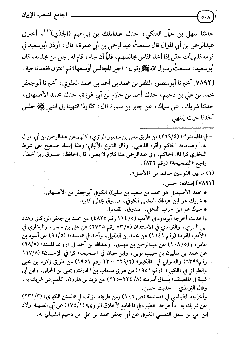 7892 - أَخْبَرَنَا أَبُو مَنْصُورٍ الظُّفْرُ بْنُ مُحَمَّدِ بْنِ أَحْمَدَ بْنِ مُحَمَّدٍ الْعَلَوِيُّ، أنا أَبُو جَعْفَرٍ مُحَمَّدُ بْنُ عَلِيِّ بْنِ دُحَيْمٍ، نا أَحْمَدُ بْنُ حَازِمِ بْنِ أَبِي غَرَزَةَ، نا مُحَمَّدٌ الْأَصْبَهَانِيُّ، نا شَرِيكٌ، عَنْ سِمَاكٍ، عَنْ جَابِرِ بْنِ سَمُرَةَ، قَالَ: " كُنَّا §إِذَا انْتَهَيْنَا إِلَى النَّبِيِّ صَلَّى الله عَلَيْهِ وَسلَّمَ جَلَسَ أَحَدُنَا حَيْثُ يَنْتَهِي "