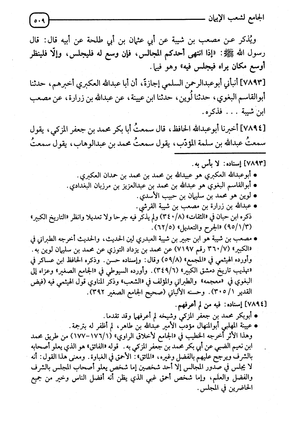 7893 - أَنْبَأَنِي أَبُو عَبْدِ الرَّحْمَنِ السُّلَمِيُّ إِجَازَةً، أَنَّ أَبَا عَبْدِ اللهِ الْعُكْبَرِيَّ أَخْبَرَهُمْ، نا أَبُو الْقَاسِمِ الْبَغَوِيُّ، نا لُوَيْنٌ، نا ابْنُ عُيَيْنَةَ، عَنْ عَبْدِ اللهِ بْنِ زُرَارَةَ، عَنْ مُصْعَبِ بْنِ شَيْبَةَ فَذَكَرَهُ
