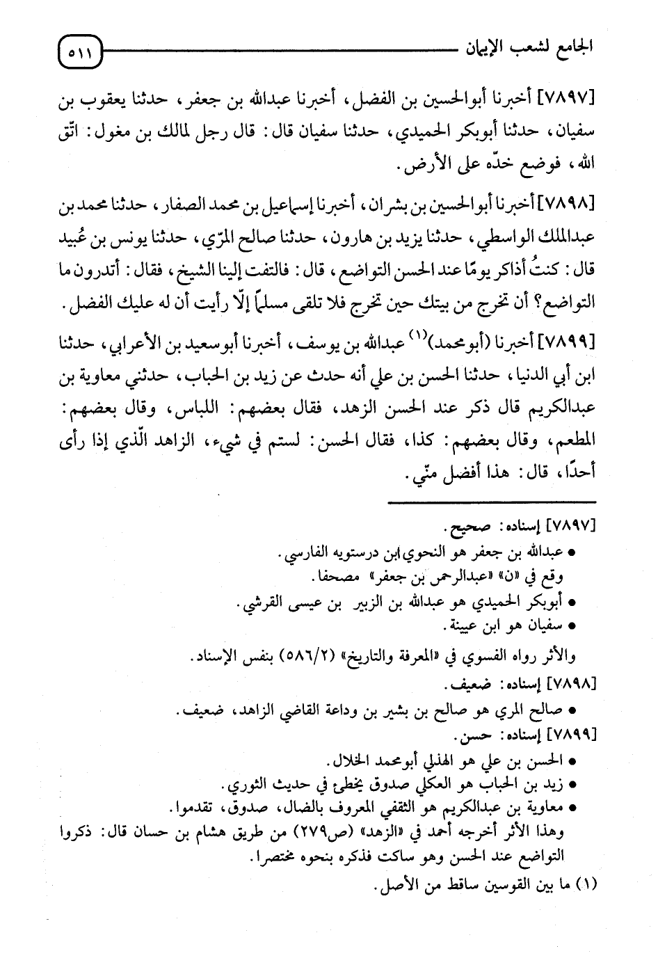 7899 - أَخْبَرَنَا عَبْدُ اللهِ بْنُ يُوسُفَ، أنا أَبُو سَعِيدِ بْنُ الْأَعْرَابِيِّ، نا ابْنُ أَبِي الدُّنْيَا، نا الْحَسَنُ بْنُ عَلِيٍّ، أَنْهُ حَدَّثَ زَيْدَ بْنَ الْحُبَابِ، حَدَّثَنِي مُعَاوِيَةُ بْنُ عَبْدِ الْكَرِيمِ، قَالَ: ذُكِرَ عِنْدَ الْحَسَنِ الزُّهْدُ، فَقَالَ بَعْضُهُمُ: اللِّبَاسُ، وَقَالَ بَعْضُهُمُ: الْمَطْعَمُ، وَقَالَ بَعْضُهُمْ كَذَا، فَقَالَ الْحَسَنُ: " لَسْتُمْ فِي شَيْءٍ، §الزَّاهِدُ الَّذِي إِذَا رَأَى أَحَدًا، قَالَ: هَذَا أَفْضَلُ مِنِّي "