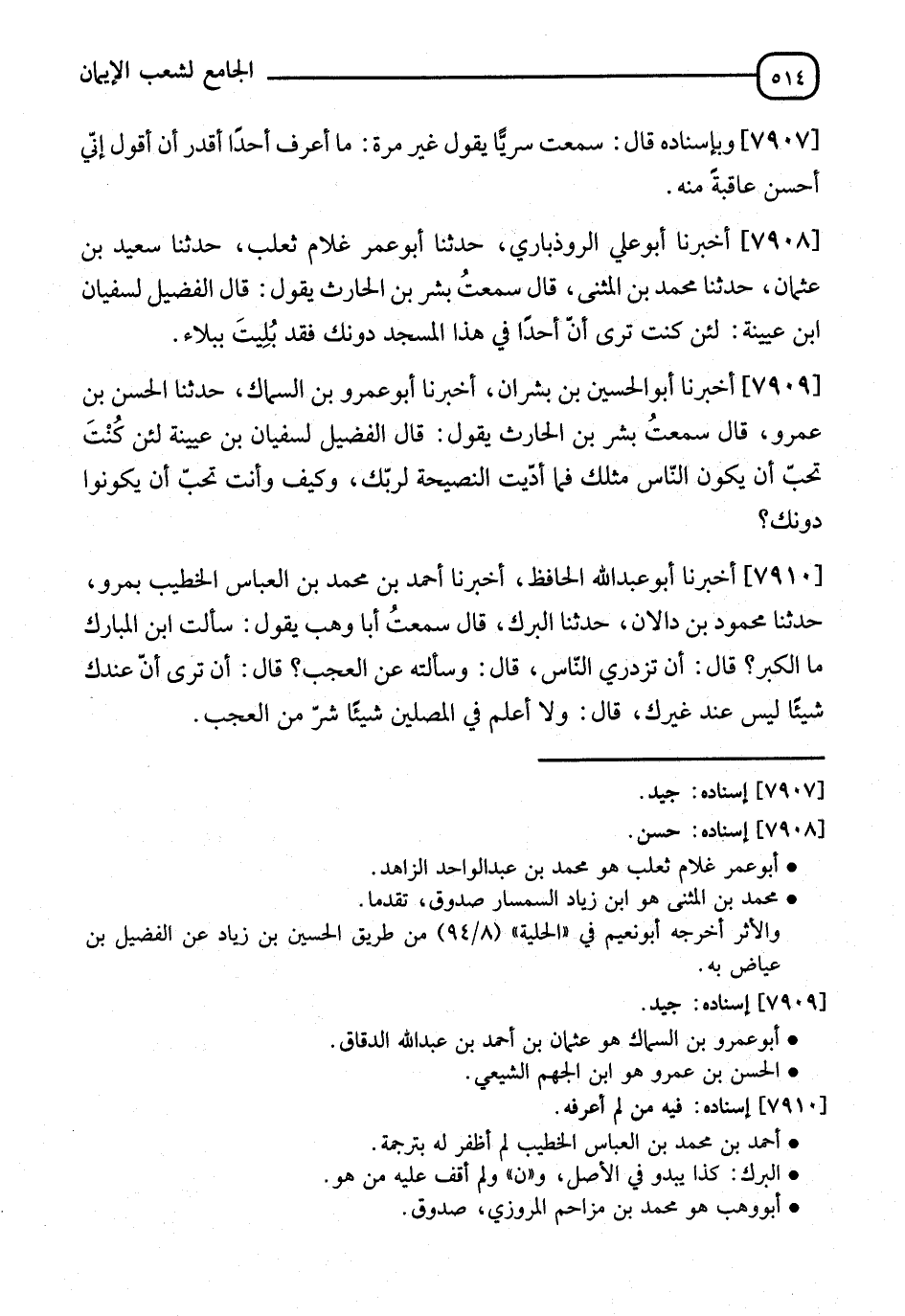 7910 - أَخْبَرَنَا أَبُو عَبْدِ اللهِ الْحَافِظُ، أنا أَحْمَدُ بْنُ مُحَمَّدِ بْنِ الْعَبَّاسِ الْخَطِيبُ، بِمَرْوَ، نا مَحْمُودُ بْنُ وَالَانَ، نا الرَّكُ، قَالَ: سَمِعْتُ أَبَا وَهْبٍ، يَقُولُ: سَأَلْتُ ابْنَ الْمُبَارَكِ: مَا §الْكِبْرُ؟ قَالَ: " أَنْ تَزْدَرِيَ النَّاسَ "، قَالَ: وَسَأَلْتُهُ عَنِ الْعُجْبِ، قَالَ: " أَنْ تَرَى أَنَّ عِنْدَكَ شَيْئًا لَيْسَ عِنْدَ غَيْرِكَ "، قَالَ: " وَلَا أَعْلَمُ فِي الْمُصَلِّينَ شَيْئًا شَرًّا مِنَ الْعُجْبِ "