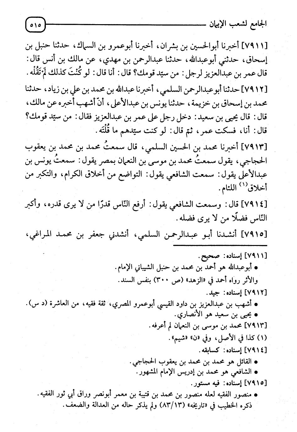 7913 - أَخْبَرَنَا مُحَمَّدُ بْنُ الْحُسَيْنِ السُّلَمِيُّ، قَالَ: سَمِعْتُ مُحَمَّدَ بْنَ مُحَمَّدِ بْنِ يَعْقُوبَ الْحَجَّاجِيَّ، يَقُولُ: سَمِعْتُ مُحَمَّدَ بْنَ مُوسَى بْنِ النُّعْمَانِ، بِمِصْرَ، يَقُولُ: سَمِعْتُ يُونُسَ بْنَ عَبْدِ الْأَعْلَى، يَقُولُ: سَمِعْتُ الشَّافِعِيَّ، يَقُولُ: " §التَّوَاضُعُ مِنْ أَخْلَاقِ الْكِرَامِ، وَالتَّكَبُّرُ مِنْ شِيَمِ أَخْلَاقِ اللِّئَامِ "،