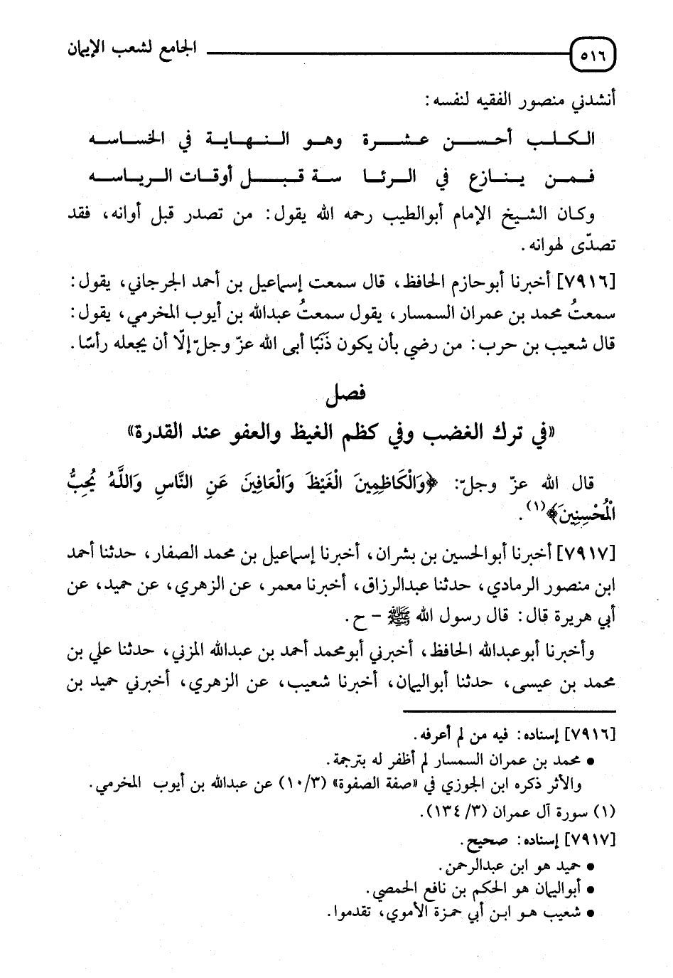 §فَصْلٌ فِي تَرْكِ الْغَضَبِ، وَفِي كَظْمِ الْغَيْظِ، وَالْعَفْوِ عِنْدَ الْقُدْرَةِ " قَالَ اللهُ عَزَّ وَجَلَّ: {وَالْكَاظِمِينَ الْغَيْظَ، وَالْعَافِينَ عَنِ النَّاسِ وَاللهُ يُحِبُّ الْمُحْسِنِينَ} [آل عمران: 134] "