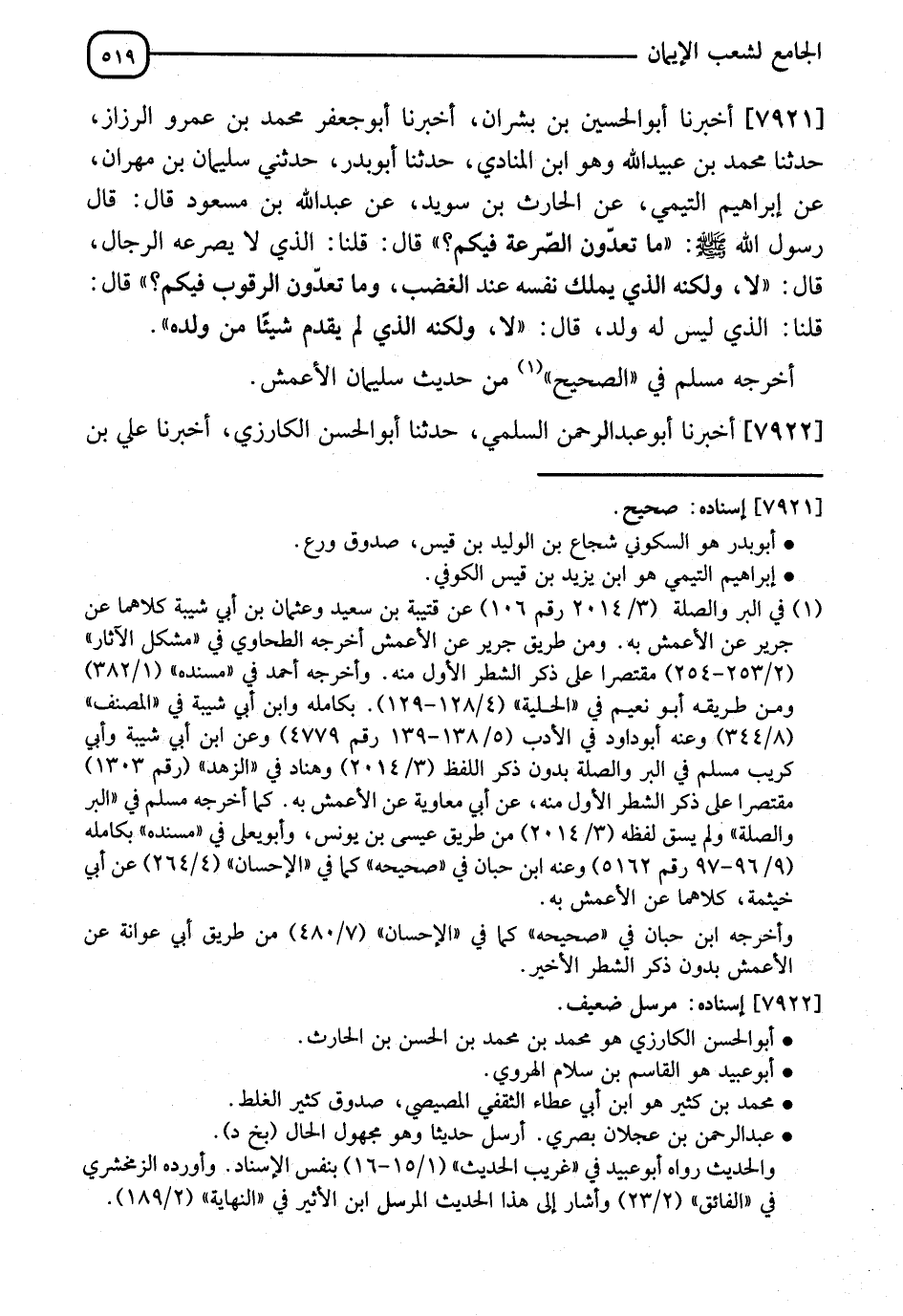 7921 - أَخْبَرَنَا أَبُو الْحُسَيْنِ بْنُ بِشْرَانَ، أنا أَبُو جَعْفَرٍ مُحَمَّدُ بْنُ عَمْرٍو الرَّزَّازُ، نا مُحَمَّدُ بْنُ عُبَيْدِ اللهِ هُوَ الْمُنَادِي، نا أَبُو بَدْرٍ، حَدَّثَنِي سُلَيْمَانُ بْنُ مِهْرَانَ، عَنْ إِبْرَاهِيمَ التَّيْمِيِّ، عَنِ الْحَارِثِ بْنِ سُوَيْدٍ، عَنْ عَبْدِ اللهِ بْنِ مَسْعُودٍ، قَالَ: قَالَ رَسُولُ اللهِ صَلَّى اللَّهُ عَلَيْهِ وَسَلَّمَ: " §مَا تَعُدُّونَ الصُّرَعَةَ فِيكُمْ؟ " قَالَ: قُلْنَا: الَّذِي لَا يَصْرَعُهُ الرِّجَالُ، قَالَ: " لَا، وَلَكِنَّهُ الَّذِي يَمْلِكُ نَفْسَهُ عِنْدَ الْغَضَبِ، مَا تَعُدُّونَ الرَّقُوبَ فِيكُمْ؟ " قَالَ: قُلْنَا: الَّذِي لَيْسَ لَهُ وَلَدٌ، قَالَ: " لَا، وَلَكِنَّهُ الَّذِي لَمْ يُقَدِّمْ شَيْئًا مِنْ وَلَدِهِ " أَخْرَجَهُ مُسْلِمٌ فِي الصَّحِيحِ، مِنْ حَدِيثِ سُلَيْمَانَ الْأَعْمَشِ