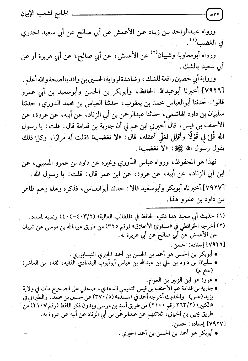 7926 - أَخْبَرَنَا أَبُو عَبْدِ اللهِ الْحَافِظُ، وَأَبُو بَكْرِ بْنُ الْحَسَنِ، وَأَبُو سَعِيدِ بْنُ أَبِي عَمْرٍو، قَالُوا: نا أَبُو الْعَبَّاسِ مُحَمَّدُ بْنُ يَعْقُوبَ، نا الْعَبَّاسُ بْنُ مُحَمَّدٍ الدُّورِيُّ، نا سُلَيْمَانُ بْنُ دَاوُدَ الْهَاشِمِيُّ، نا عَبْدُ الرَّحْمَنِ بْنُ أَبِي الزِّنَادِ، عَنْ عُرْوَةَ، عَنِ الْأَحْنَفِ بْنِ قَيْسٍ، قَالَ: أَخْبَرَنِي ابْنُ عَمٍّ لِي، عَنْ حَارِثَةَ بْنِ قُدَامَةَ، قَالَ: قُلْتُ: يَا رَسُولَ اللهِ، قُلْ لِي قَوْلًا وَأَقْلِلْ لِعَلِّي أَعْقِلُهُ، قَالَ: " §لَا تَغْضَبْ "، قَالَ: فَقُلْتُ لَهُ مِرَارًا، وَكُلُّ ذَلِكَ يَقُولُ رَسُولُ اللهِ صَلَّى اللَّهُ عَلَيْهِ وَسَلَّمَ: " لَا تَغْضَبْ " هَذَا الْمَحْفُوظُ، وَرَوَاهُ عَبَّاسٌ الدُّورِيُّ، وَغَيْرُهُ، عَنْ دَاوُدَ بْنِ عَمْرٍو الضَّبِّيِّ، عَنِ ابْنِ أَبِي الزِّنَادِ، عَنْ أَبِيهِ، عَنْ عُرْوَةَ، عَنِ ابْنِ عُمَرَ، قَالَ: قُلْتُ: يَا رَسُولَ اللهِ