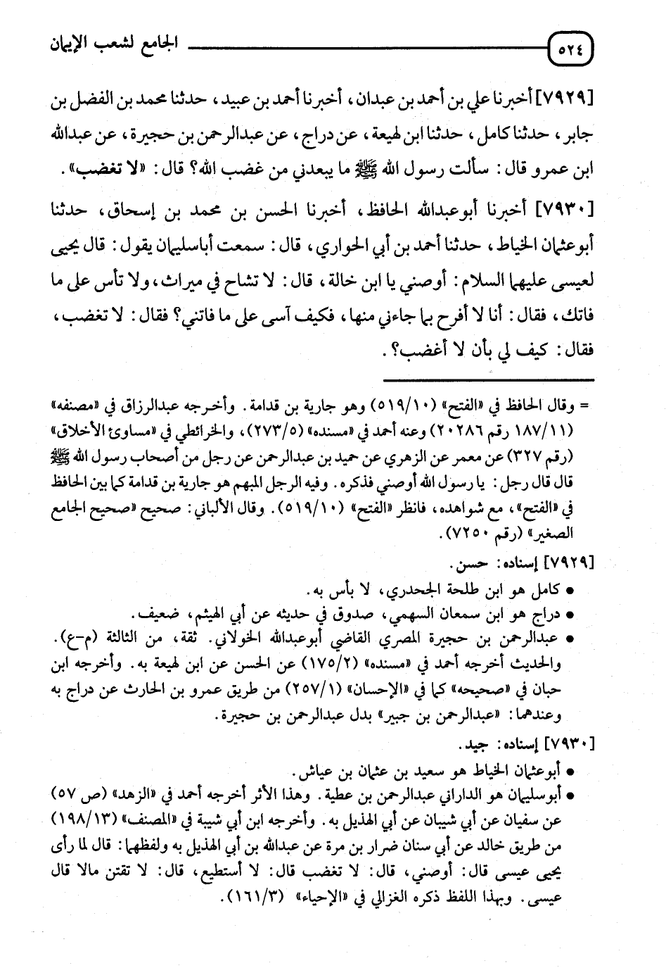 7929 - أَخْبَرَنَا عَلِيُّ بْنُ أَحْمَدَ بْنِ عَبْدَانَ، أنا أَحْمَدُ بْنُ عُبَيْدٍ، نا مُحَمَّدُ بْنُ الْفَضْلِ بْنِ جَابِرٍ، نا كَامِلٌ، نا ابْنُ لَهِيعَةَ، عَنْ دَرَّاجٍ، عَنْ عَبْدِ الرَّحْمَنِ بْنِ حُجَيْرَةَ، عَنْ عَبْدِ الرَّحْمَنِ بْنِ عَمْرِو بْنِ الْعَاصِ، عَنْ عَبْدِ اللهِ بْنِ عَمْرٍو، قَالَ: سَأَلْتُ رَسُولَ اللهِ صَلَّى اللَّهُ عَلَيْهِ وَسَلَّمَ: مَا يُبْعِدُنِي مِنْ غَضِبِ اللهِ؟ قَالَ: §" لَا تَغْضَبْ "