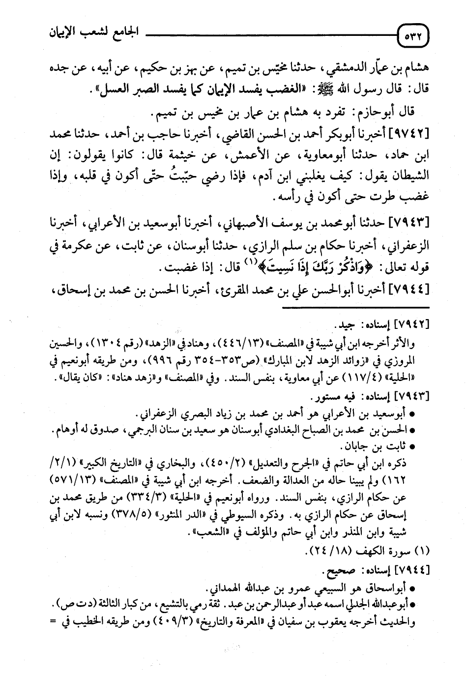 7943 - حَدَّثَنَا أَبُو مُحَمَّدِ بْنُ يُوسُفَ الْأَصْبَهَانِيُّ، أنا أَبُو سَعِيدِ بْنُ الْأَعْرَابِيِّ، أنا الزَّعْفَرَانِيُّ، أنا حَكَّامُ بْنُ سَلْمٍ الرَّازِيُّ، نا أَبُو سِنَانٍ، عَنْ ثَابِتٍ، عَنْ عِكْرِمَةَ فِي قَوْلِهِ تَعَالَى: {§وَاذْكُرْ رَبَّكَ إِذَا نَسِيتَ} [الكهف: 24]، قَالَ: " إِذَا غَضِبْتَ "