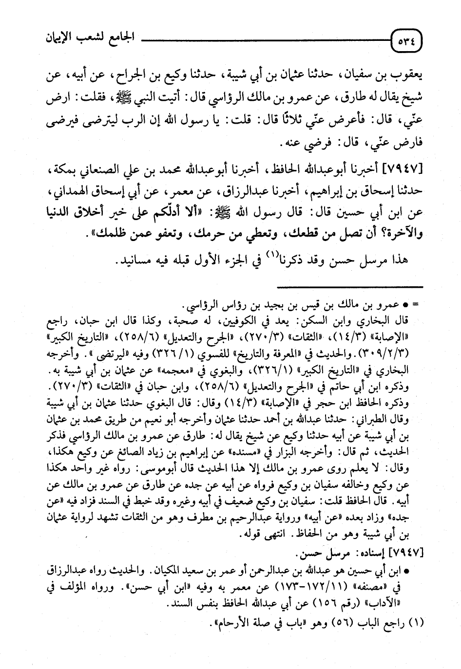7947 - أَخْبَرَنَا أَبُو عَبْدِ اللهِ الْحَافِظُ، أنا أَبُو عَبْدِ اللهِ مُحَمَّدُ بْنُ عَلِيٍّ الصَّنْعَانِيُّ بِمَكَّةَ، نا إِسْحَاقُ بْنُ إِبْرَاهِيمَ، أنا عَبْدُ الرَّزَّاقِ، عَنْ مَعْمَرٍ، عَنْ أَبِي إِسْحَاقَ الْهَمَذَانِيِّ، عَنِ ابْنِ أَبِي حُسَيْنٍ، قَالَ: قَالَ رَسُولُ اللهِ صَلَّى اللَّهُ عَلَيْهِ وَسَلَّمَ: " أَلَا أَدُلُّكُمْ عَلَى §خَيْرِ أَخْلَاقِ أَهْلِ الدُّنْيَا وَالْآخِرَةِ؟ أَنْ تَصِلَ مَنْ قَطَعَكَ، وَتُعْطِيَ مَنْ حَرَمَكَ، وَتَعْفُوَ عَمَّنْ ظَلَمَكَ " هَذَا مُرْسَلٌ حَسَنٌ وَقَدْ ذَكَرْنَا فِي الْجُزْءِ الْأَوَّلِ قَبْلَهُ فِيهِ مَسَانِيدَ