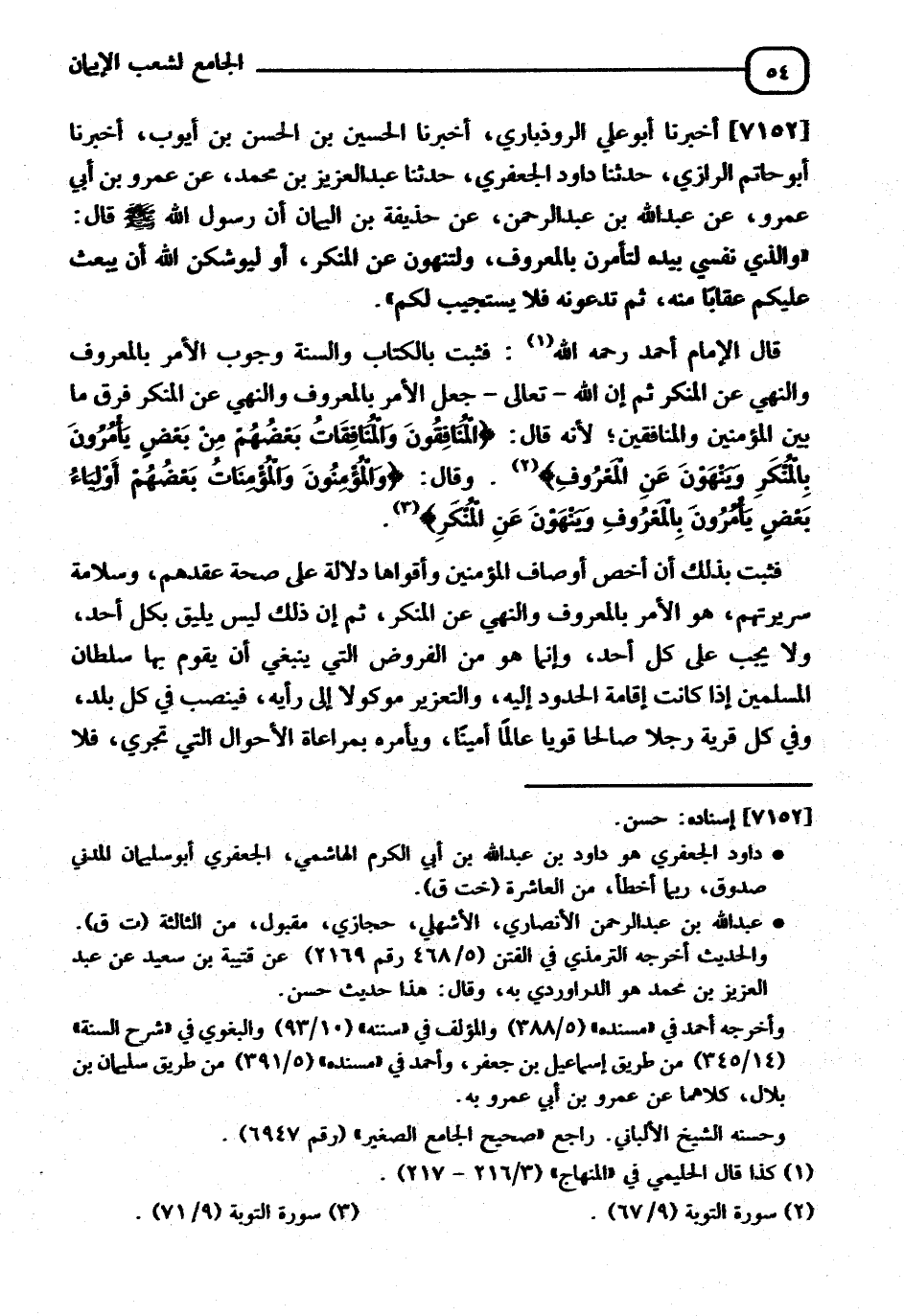 7152 - أَخْبَرَنَا أَبُو عَلِيٍّ الرُّوذْبَارِيُّ، أنا الْحُسَيْنُ بْنُ الْحَسَنِ بْنِ أَيُّوبَ، أنا أَبُو حَاتِمٍ الرَّازِيُّ، نا دَاوُدُ الْجَعْفَرِيُّ، نا عَبْدُ الْعَزِيزِ بْنُ مُحَمَّدٍ، عَنْ عَمْرِو بْنِ أَبِي عَمْرٍو، عَنْ عَبْدِ اللهِ بْنِ عَبْدِ الرَّحْمَنِ، عَنْ حُذَيْفَةَ بْنِ الْيَمَانِ، أَنَّ رَسُولَ اللهِ صَلَّى اللَّهُ عَلَيْهِ وَسَلَّمَ قَالَ: " وَالَّذِي نَفْسِي بِيَدِهِ، §لَتَأْمُرُنَّ بِالْمَعْرُوفِ وَلَتَنْهَوُنَّ عَنِ الْمُنْكَرِ، أَوْ لَيُوشِكَنَّ اللهُ أَنْ يَبْعَثَ عَلَيْكُمْ عِقَابًا مِنْهُ، ثُمَّ تَدْعُونَهُ فَلَا يَسْتَجِيبُ لَكُمْ " قَالَ الْإِمَامُ أَحْمَدُ رَحِمَهُ اللهُ: " فَثَبَتَ بِالْكِتَابِ وَالسُّنَّةِ وُجُوبُ الْأَمْرِ بِالْمَعْرُوفِ وَالنَّهْيِ عَنِ الْمُنْكَرِ، ثُمَّ إِنَّ اللهَ تَعَالَى جَعَلَ الْأَمْرَ بِالْمَعْرُوفِ وَالنَّهْيَ عَنِ الْمُنْكَرِ، فَرْقَ مَا بَيْنَ الْمُؤْمِنِينَ وَالْمُؤْمِنَاتِ لِأَنَّهُ قَالَ: {الْمُنَافِقُونَ والْمُنَافِقَاتُ بَعْضُهُمْ مِنْ بَعْضٍ يَأْمُرُونَ بِالْمُنْكَرِ وَيَنْهَوْنَ عَنِ الْمَعْرُوفِ} [التوبة: 67]، وَقَالَ: {الْمُؤْمِنُونَ وَالْمُؤْمِنَاتُ بَعْضُهُمْ أَوْلِيَاءُ بَعْضٍ يَأْمُرُونَ بِالْمَعْرُوفِ وَيَنْهَوْنَ عَنِ الْمُنْكَرِ} [التوبة: 71] فَثَبَتَ بِذَلِكَ أَنَّ أَخَصَّ أَوْصَافِ الْمُؤْمِنِينَ وَأَقْوَاهَا دِلَالَةً عَلَى صِحَّةِ عَقْدِهِمْ وَسَلَامَةِ سَرِيرَتِهِمْ هُوَ الْأَمْرُ بِالْمَعْرُوفِ، وَالنَّهْيُ عَنِ الْمُنْكَرِ، ثُمَّ إِنَّ ذَلِكَ لَيْسَ يَلِيقُ بِكُلِّ أَحَدٍ، وَإِنَّمَا هُوَ مِنَ الْفُرُوضِ الَّتِي يَنْبَغِي أَنْ يَقُومَ بِهَا سُلْطَانُ الْمُسْلِمِينَ إِذَا كَانَتْ إِقَامَةُ الْحُدُودِ إِلَيْهِ، وَالتَّعْزِيزُ مَوْكُولًا إِلَى رَأْيِهِ، فَيَنْصِبُ فِي كُلِّ بَلَدٍ، وَفِي كُلِّ قَرْيَةٍ رَجُلًا صَالِحًا قَوِيًّا عَالِمًا أَمِينًا، وَيَأْمُرُهُ بِمُرَاعَاةِ الْأَحْوَالِ الَّتِي تَجْرِي، فَلَا -[55]- يَرَى وَلَا يَسْمَعُ مُنْكَرًا إِلَّا غَيَّرَهُ، وَلَا يُبْقِي مَعْرُوفًا مُحْتَاجًا إِلَى الْأَمْرِ بِهِ إِلَّا أَمَرَهُ، وَكُلَّمَا وَجَبَ عَلَى فَاسِقٍ حَدٌّ أَقَامَهُ وَلَمْ يُعَطِّلْهُ، فَالَّذِي شَرَعَهُ أَعْلَمُ بِطَرِيقِ سِيَاسَتِهِمْ، قَالَ: وَكُلُّ مَنْ كَانَ مِنْ عُلَمَاءِ الْمُسْلِمِينَ الَّذِينَ يَجْمَعُونَ بَيْنَ فَضْلِ الْعِلْمِ، وَصَلَاحِ الْعَمَلِ، فَعَلَيْهِ أَنْ يَدْعُوَ إِلَى الْمَعْرُوفِ وَيَزْجُرَ عَنِ الْمُنْكَرِ، بِمِقْدَارِ طَاقَتِهِ، فَإِنْ كَانَ تَعْلِيقُ إِبْطَالِ الْمُنْكَرِ وَرَفْعُهُ وَرَدْعُ الْمُتَعَاطِي لَهُ عَنْ فِعْلِهِ، وَإِنْ كَانَ لَا يُطِيقُ ذَلِكَ بِنَفْسِهِ، وَيُطِيقُهُ بِمَنْ يَسْتَغْنِي عَنْ فِعْلِهِ، إِلَّا مَا كَانَ طَرِيقُهُ طَرِيقَ الْحُدُودِ وَالْعُقُوبَةِ، فَإِنَّ ذَلِكَ إِلَى السُّلْطَانِ دُونَ غَيْرِهِ، وَإِنْ كَانَ لَا يُطِيقُ إِلَّا الْقَوْلَ قَالَ، وَإِنْ لَمْ يُطِقْ إِلَّا الْإِنْكَارَ بِالْقَلْبِ أَنْكَرَ، وَالْأَمْرُ بِالْمَعْرُوفِ، فِي مِثْلِ النَّهْيِ عَنِ الْمُنْكَرِ، إِنْ سُمِعَ الْعَالِمُ الْمُصْلِحُ لَا يَدْعُو إِلَيْهِ وَيَأْمُرُ بِهِ فُعِلَ، وَإِنْ لَمْ يَقْدِرْ إِلَّا عَلَى الْقَوْلِ، قَالَ: وَإِنْ لَمْ يَقْدِرْ إِلَّا عَلَى الْإِرَادَةِ بِقَلْبِهِ أَرَادَهُ وَتَمَنَّى عَلَى اللهِ عَزَّ وَجَلَّ، فَلَعَلَّهُ أَنْ يُشَفِّعَهُ بِهِ "