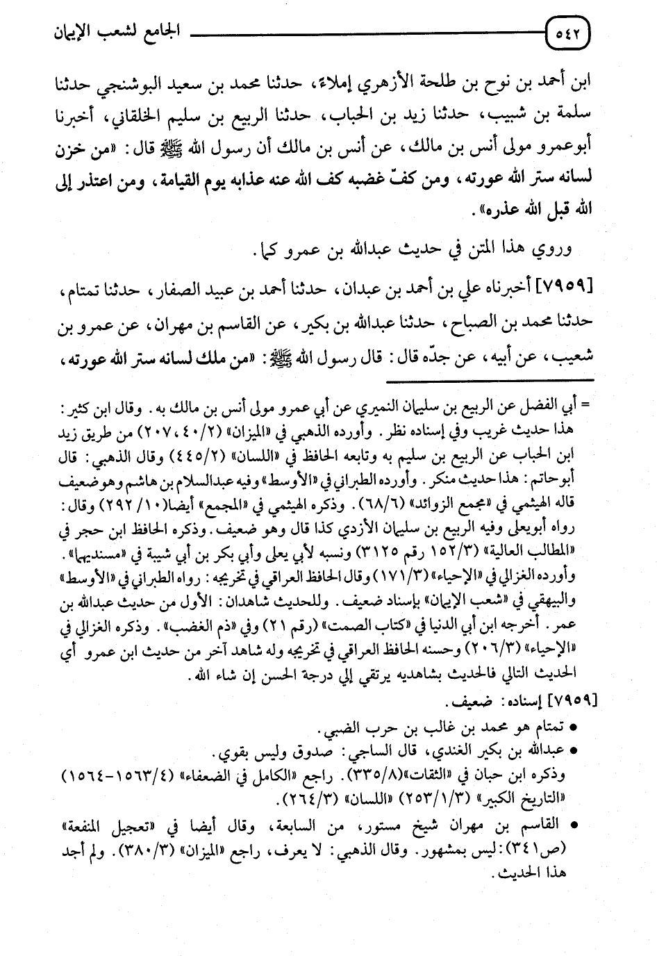 7959 - أَخْبَرَنَاهُ عَلِيُّ بْنُ أَحْمَدَ بْنِ عَبْدَانَ، نا أَحْمَدُ بْنُ عُبَيْدٍ الصَّفَّارُ، نا تَمْتَامٌ، نا مُحَمَّدُ بْنُ الصَّبَّاحِ، نا عَبْدُ اللهِ بْنُ بُكَيْرٍ، عَنِ الْقَاسِمِ بْنِ مِهْرَانَ، عَنْ عَمْرِو بْنِ شُعَيْبٍ، عَنْ أَبِيهِ، عَنْ جَدِّهِ، قَالَ: قَالَ رَسُولُ اللهِ صَلَّى اللَّهُ عَلَيْهِ وَسَلَّمَ: " §مَنْ مَلَكَ لِسَانَهُ سَتَرَ اللهُ عَوْرَتَهُ، -[543]- وَمَنْ مَلَكَ غَضَبَهُ كَفَّ اللهُ عَنْهُ عَذَابَهُ، وَمَنِ اعْتَذَرَ إِلَى اللهِ فِي الدُّنْيَا قَبِلَ اللهُ مَعْذِرَتَهُ "