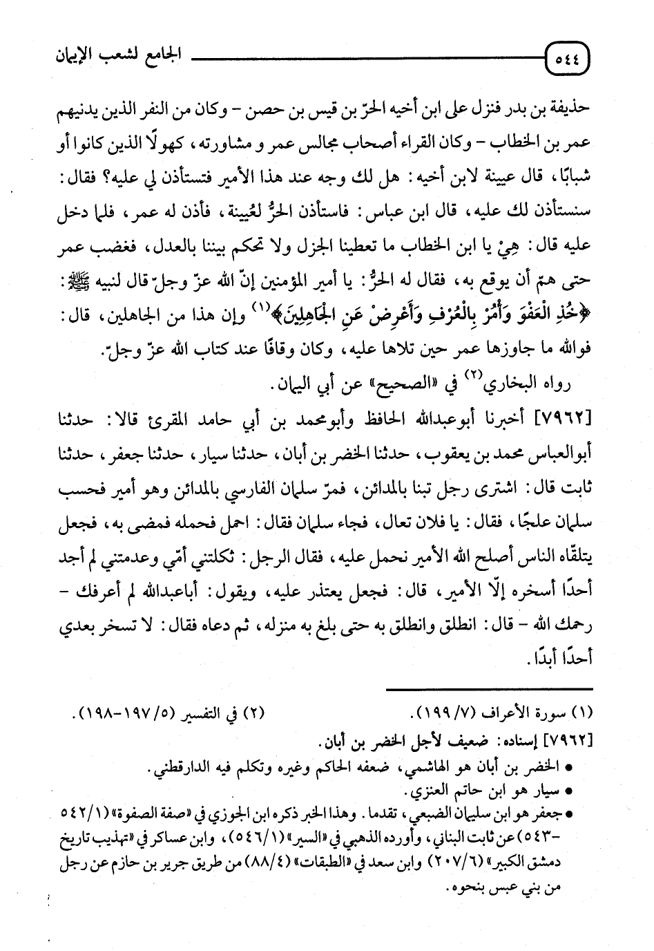 7962 - أَخْبَرَنَا أَبُو عَبْدِ اللهِ الْحَافِظُ، وَأَبُو مُحَمَّدِ بْنُ أَبِي حَامِدٍ الْمُقْرِئُ، قَالَا: نا أَبُو الْعَبَّاسِ مُحَمَّدُ بْنُ يَعْقُوبَ، نا الْخَضِرُ بْنُ أَبَانَ، نا سَيَّارٌ، نا جَعْفَرٌ، نا ثَابِتٌ، قَالَ: اشْتَرَى رَجُلٌ بَيْتًا بِالْمَدَائِنِ فَمَرَّ سَلْمَانُ الْفَارِسِيُّ بِالْمَدَائِنِ وَهُوَ أَمِيرٌ، فَحَسِبَ سَلْمَانَ عِلْجًا، فَقَالَ: يَا فُلَانُ تَعَالَ، فَجَاءَ سَلْمَانُ، فَقَالَ: احْمِلْ، فَحَمَلَهُ فَمَضَى بِهِ، فَجَعَلَ يَتَلَقَّاهُ النَّاسُ: أَصْلَحَ اللهُ الْأَمِيرَ، نَحْمِلُ عَنْكَ، وَيَا أَبَا عَبْدِ اللهِ نَحْمِلُ عَنْكَ، أَبَا عَبْدِ اللهِ نَحْمِلُ عَنْكَ، فَقَالَ الرَّجُلُ: ثَكَلَتْنِي أُمِّي وَعَدِمَتْنِي، لَمْ أَجِدْ أَحَدًا أُسَخِّرُهُ إِلَّا الْأَمِيرَ، قَالَ: فَجَعَلَ يَعْتَذِرُ إِلَيْهِ وَيَقُولُ: أَبَا عَبْدِ اللهِ لَمْ أَعْرِفْكَ رَحِمَكَ اللهُ، قَالَ: انْطَلِقْ، فَانْطَلَقَ بِهِ حَتَّى بَلَغَ بِهِ مَنْزِلَهُ، ثُمَّ دَعَاهُ، فَقَالَ: §" لَا تُسَخِّرْ بَعْدِي أَحَدًا أَبَدًا "