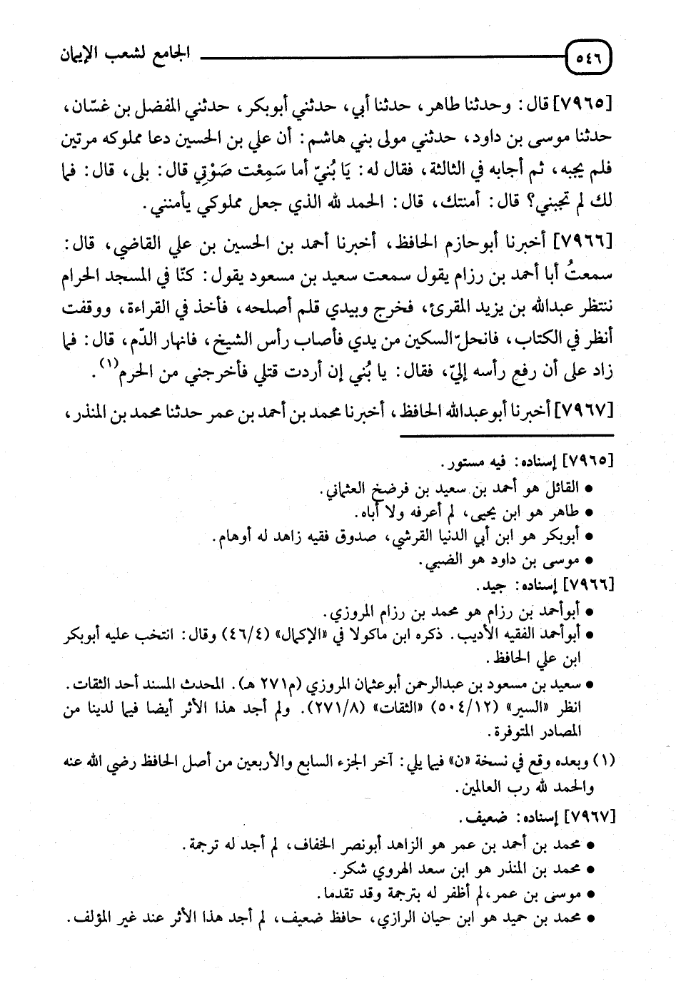7967 - أَخْبَرَنَا أَبُو عَبْدِ اللهِ الْحَافِظُ، أنا مُحَمَّدُ بْنُ أَحْمَدَ بْنِ عُمَرَ، نا مُحَمَّدُ بْنُ الْمُنْذِرِ، -[547]- حَدَّثَنِي مُوسَى بْنُ عُمَرَ، قَالَ: سَمِعْتُ مُحَمَّدَ بْنَ حُمَيْدٍ، وَنُوحَ بْنَ حَبِيبٍ، يَقُولَانِ: إِنَّا كُنَّا عِنْدَ ابْنِ الْمُبَارَكِ فَأَلَحُّوا عَلَيْهِ، فَقَالَ: هَاتُوا كُتُبَكُمْ حَتَّى أَقْرَأَ، فَجَعَلُوا يَرْمُونَ إِلَيْهِ الْكُتُبَ مِنْ قَرِيبٍ وَمِنْ بَعِيدٍ، وَكَانَ رَجُلٌ مِنْ أَهْلِ الرَّيِّ يُسَمِّعُ كِتَابَ الِاسْتِئْذَانِ، فَرَمَى بِكِتَابِهِ، فَأَصَابَ صَلْعَةَ ابْنِ الْمُبَارَكِ حَرْفُ كِتَابِهِ، فَانْشَقَّ وَسَالَ الدَّمُ، فَجَعَلَ ابْنُ الْمُبَارَكِ يُعَالِجُ الدَّمَ حَتَّى سَكَنَ، ثُمَّ قَالَ: " §سُبْحَانَ اللهِ، كَادَ أَنْ يَكُونَ قِتَالًا " ثُمَّ بَدَأَ بِكِتَابِ الرَّجُلِ فَقَرَأَهُ