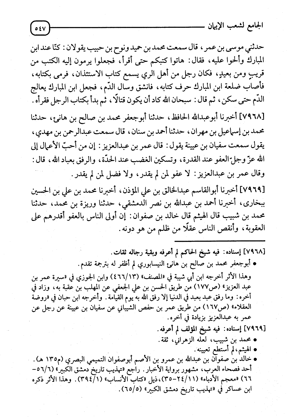 7968 - أَخْبَرَنَا أَبُو عَبْدِ اللهِ الْحَافِظُ، نا أَبُو جَعْفَرٍ مُحَمَّدُ بْنُ صَالِحِ بْنِ هَانِئٍ، نا مُحَمَّدُ بْنُ إِسْمَاعِيلَ بْنِ مِهْرَانَ، نا أَحْمَدُ بْنُ سِنَانٍ، قَالَ: سَمِعْتُ عَبْدَ الرَّحْمَنِ بْنَ مَهْدِيٍّ، يَقُولُ: سَمِعْتُ سُفْيَانَ بْنَ عُيَيْنَةَ يَقُولُ: قَالَ عُمَرُ بْنُ عَبْدِ الْعَزِيزِ: " إِنَّ §مِنْ أَحَبِّ الْأَعْمَالِ إِلَى اللهِ عَزَّ وَجَلَّ الْعَفْوَ عِنْدَ الْقُدْرَةِ، وَتَسْكِينَ الْغَضَبِ عِنْدَ الْحِدَّةِ، وَالرِّفْقَ بِعِبَادِ اللهِ "، قَالَ: وَقَالَ عُمَرُ بْنُ عَبْدِ الْعَزِيزِ: " لَا عَفْوَ لِمَنْ لَمْ يَقْدِرْ، وَلَا فَضْلَ لِمَنْ لَمْ يَقْدِرْ "
