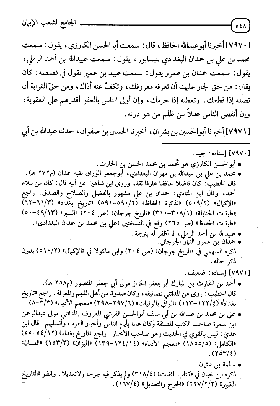 7970 - أَخْبَرَنَا أَبُو عَبْدِ اللهِ الْحَافِظُ، قَالَ: سَمِعْتُ أَبَا الْحَسَنِ الْكَارِزِيَّ، يَقُولُ: سَمِعْتُ عَلِيَّ بْنَ مُحَمَّدِ بْنِ حَمْدَانَ الْبَغْدَادِيَّ، بِنَيْسَابُورَ، يَقُولُ: سَمِعْتُ عُبَيْدَ اللهِ بْنَ أَحْمَدَ الرَّمْلِيَّ، يَقُولُ: سَمِعْتُ حَمْدَانَ بْنَ عَمْرٍو، يَقُولُ: سَمِعْتُ عُبَيْدَ بْنَ عُمَيْرٍ، يَقُولُ فِي قَصَصِهِ: كَانَ يُقَالُ: " §مِنْ حَقِّ الْجَارِ عَلَيْكَ أَنْ تُعَرِّفَهُ مَعْرُوفَكَ، وَتَكُفَّ عَنْهُ أَذَاكَ، وَمِنْ حَقِّ الْقَرَابَةِ أَنْ تَصِلَهُ إِذَا قَطَعَكَ، وَتُعْطِيَهُ إِذَا حَرَمَكَ، وَإِنَّ أَوْلَى النَّاسِ بِالْعَفْوِ أَقْدَرُهُمْ عَلَى الْعُقُوبَةِ، وَإِنَّ أَنْقَصَ النَّاسِ عَقْلًا مَنْ ظَلَمْ مَنْ هُوَ دُونَهُ "