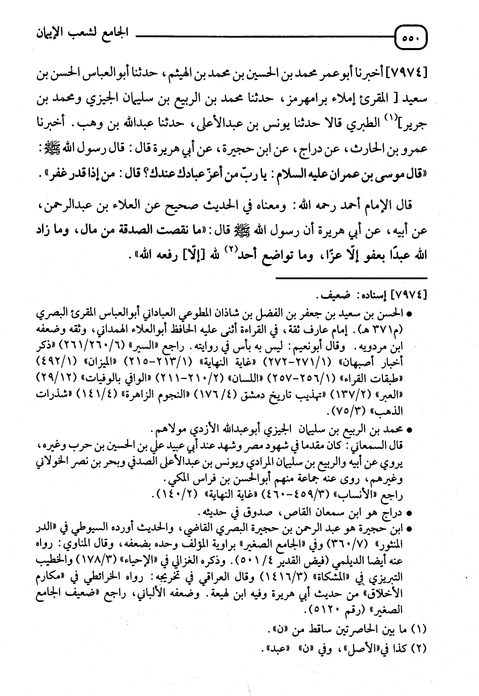 7974 - أَخْبَرَنَا أَبُو عُمَرَ مُحَمَّدُ بْنُ الْحُسَيْنِ بْنِ مُحَمَّدِ بْنِ الْهَيْثَمِ، نا أَبُو الْعَبَّاسِ الْحُسَيْنُ بْنُ سَعِيدٍ الْمُقْرِئُ إِمْلَاءً بِرَامْ هُرْمُزَ، نا مُحَمَّدُ بْنُ الرَّبِيعِ بْنِ سُلَيْمَانَ الْجِيزِيُّ، وَمُحَمَّدُ بْنُ جَرِيرٍ الطَّبَرِيُّ، قَالَا: نا يُونُسُ بْنُ عَبْدِ الْأَعْلَى، نا عَبْدُ اللهِ بْنُ وَهْبٍ، أنا عَمْرُو بْنُ الْحَارِثِ، عَنْ دَرَّاجٍ، عَنِ ابْنِ حُجَيْرَةَ، عَنْ أَبِي هُرَيْرَةَ، قَالَ: قَالَ رَسُولُ اللهِ صَلَّى اللَّهُ عَلَيْهِ وَسَلَّمَ: " قَالَ مُوسَى بْنُ عِمْرَانَ عَلَيْهِ السَّلَامُ: يَا رَبِّ، مَنْ أَعَزُّ عِبَادِكَ عِنْدَكَ؟ قَالَ: §مَنْ إِذَا قَدَرَ غَفَرَ "