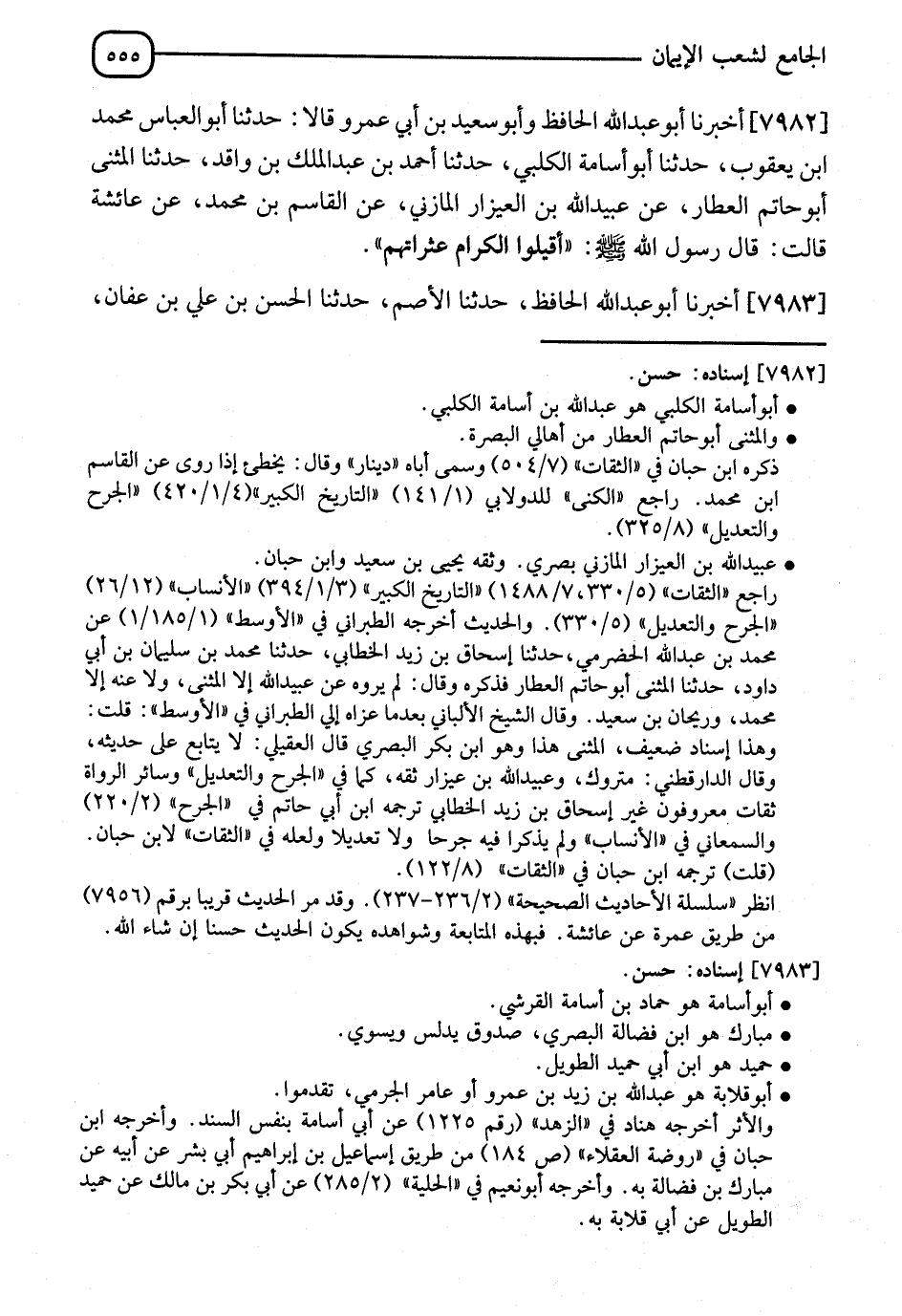 7982 - أَخْبَرَنَا أَبُو عَبْدِ اللهِ الْحَافِظُ، وَأَبُو سَعِيدِ بْنُ أَبِي عَمْرٍو، قَالَا: نا أَبُو الْعَبَّاسِ مُحَمَّدُ بْنُ يَعْقُوبَ، نا أَبُو أُسَامَةَ الْحَلَبِيُّ، نا أَحْمَدُ بْنُ عَبْدِ الْمَلِكِ بْنِ وَاقِدٍ، نا الْمُثَنَّى أَبُو حَاتِمٍ الْعَطَّارُ، عَنْ عُبَيْدِ اللهِ بْنِ الْغِيرَارِ الْمَازِنِيِّ، عَنِ الْقَاسِمِ بْنِ مُحَمَّدٍ، عَنْ عَائِشَةَ، قَالَتْ: قَالَ رَسُولُ اللهِ صَلَّى اللَّهُ عَلَيْهِ وَسَلَّمَ: §" أَقِيلُوا الْكِرَامَ عَثَرَاتِهِمْ "