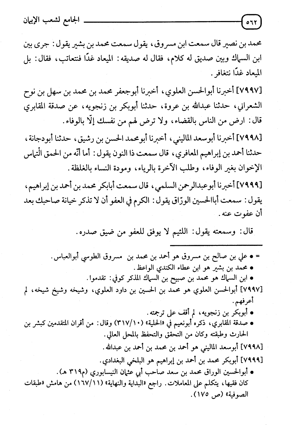 7997 - أَخْبَرَنَا أَبُو الْحَسَنِ الْعَلَوِيُّ، أنا أَبُو جَعْفَرٍ مُحَمَّدُ بْنُ مُحَمَّدِ بْنِ سَهْلِ بْنِ نُوحٍ الشَّعْرَانِيُّ، نا عَبْدُ اللهِ بْنُ عُرْوَةَ، نا أَبُو بَكْرِ بْنُ زَنْجَوَيْهِ، عَنْ صَدَقَةَ الْمَقَابِرِيَّ، قَالَ: " §ارْضَ مِنَ النَّاسِ بِالْقَضَاءِ، وَلَا تَرْضَ لَهُمْ مِنْ نَفْسِكَ إِلَّا بِالْوَفَاءِ "