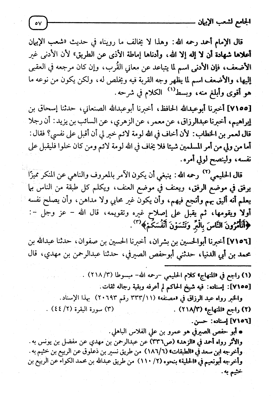 7155 - أَخْبَرَنَا أَبُو عَبْدِ اللهِ الْحَافِظُ، أنا أَبُو عَبْدِ اللهِ الصَّنْعَانِيُّ، نا إِسْحَاقُ بْنُ إِبْرَاهِيمَ، أنا عَبْدُ الرَّزَّاقِ، عَنْ مَعْمَرٍ، عَنِ الزُّهْرِيِّ، عَنِ السَّائِبِ بْنِ يَزِيدَ، أَنَّ رَجُلًا قَالَ لِعُمَرَ بْنِ الْخَطَّابِ: لَأَنْ أَخَافَ فِي اللهِ لَوْمَةَ لَائِمٍ خَيْرٌ لِي، أَمْ أُقْبِلُ عَلَى نَفْسِي؟ فَقَالَ: §" أَمَّا مَنْ وَلِيَ مِنْ أَمْرِ الْمُسْلِمِينَ شَيْئًا فَلَا يَخَافُ فِي اللهِ لَوْمَةَ لَائِمٍ، وَمَنْ كَانَ خِلْوًا فَلْيُقْبِلْ عَلَى نَفْسِهِ، وَلْيَنْصَحْ لِوَلِيِّ أَمْرِهِ " قَالَ الْحَلِيمِيُّ رَحِمَهُ اللهُ: " يَنْبَغِي أَنْ يَكُونَ الْآمِرُ بِالْمَعْرُوفِ والنَّاهِي عَنِ الْمُنْكَرِ مُمَيَّزًا بِرِفْقٍ فِي مَوْضِعِ الرِّفْقِ، وبِعُنْفٍ فِي مَوْضِعِ الْعُنْفِ، وَيُكَلِّمُ كُلَّ طَبَقَةٍ مِنَ النَّاسِ بِمَا يَعْلَمُ يَلِيقُ بِهِمْ وَأَنْجَعُ فِيهِمْ، وَأَنْ يَكُونَ غَيْرَ مُحَابٍ، وَلَا مُدَاهِنٍ، وَأَنْ يُصْلِحَ نَفْسَهُ أَوَّلًا وَيُقَوِّمَهَا ثُمَّ يُقْبِلَ عَلَى إِصْلَاحِ غَيْرِهِ وَتَقْوِيمِهِ، قَالَ اللهُ عَزَّ وَجَلَّ: {أَتَأْمُرُونَ النَّاسَ بِالْبِرِّ وَتَنْسَوْنَ أَنْفُسَكُمْ} [البقرة: 44] "