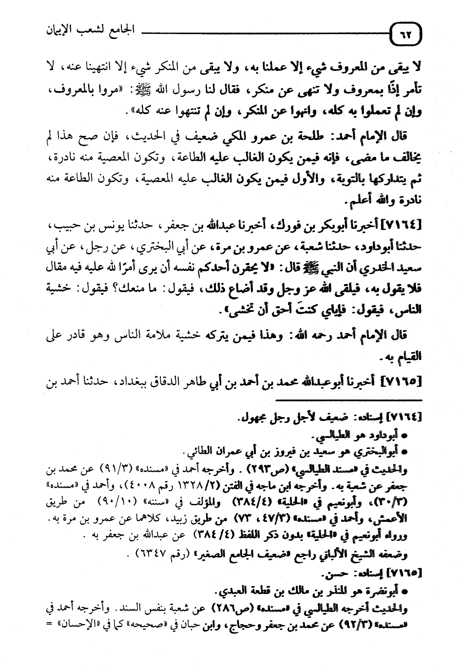 7164 - أَخْبَرَنَا أَبُو بَكْرِ بْنُ فُورَكٍ، أنا عَبْدُ اللهِ بْنُ جَعْفَرٍ، نا يُونُسُ بْنُ حَبِيبٍ، نا أَبُو دَاوُدَ، نا شُعْبَةُ، عَنِ عَمْرِو بْنِ مُرَّةَ، عَنْ أَبِي الْبَخْتَرِيِّ، عَنْ رَجُلٍ، عَنْ أَبِي سَعِيدٍ الْخُدْرِيِّ، أَنَّ النَّبِيَّ صَلَّى اللَّهُ عَلَيْهِ وَسَلَّمَ قَالَ: §" لَا يَحْقِرَنَّ أَحَدُكُمْ نَفْسَهُ أَنْ يَرَى أَمْرَ اللهِ عَلَيْهِ فِيهِ، فَقَالَ: فَلَا يَقُولُ بِهِ فَيَلْقَى اللهَ عَزَّ وَجَلَّ وَقَدْ أَضَاعَ ذَلِكَ فَيَقُولُ: مَا مَنَعَكَ؟ فَيَقُولُ: خَشْيَةُ النَّاسِ، فَيَقُولُ: فَإِيَّايَ كُنْتُ أَحَقَّ أَنْ تَخْشَى " قَالَ الْإِمَامُ أَحْمَدُ رَحِمَهُ اللهُ: " وَهَذَا فِيمَنْ يَتْرُكُهُ خَشْيَةَ مَلَامَةِ النَّاسِ وَهُوَ قَادِرٌ عَلَى الْقِيَامِ بِهِ "