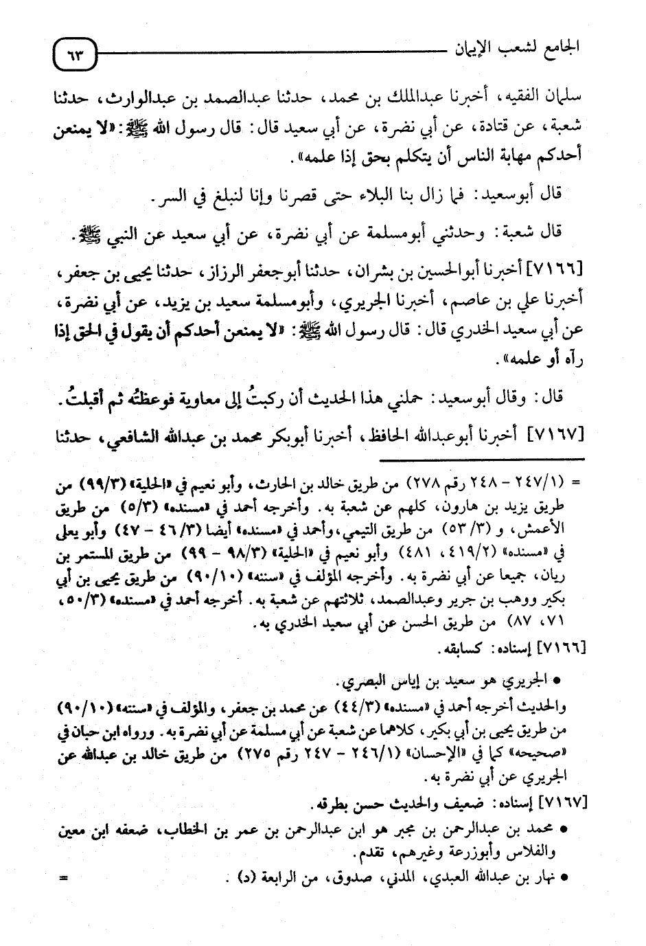 7166 - أَخْبَرَنَا أَبُو الْحُسَيْنِ بْنُ بِشْرَانَ، أنا أَبُو جَعْفَرٍ الرَّزَّازُ، نا يَحْيَى بْنُ جَعْفَرٍ، أنا عَلِيُّ بْنُ عَاصِمٍ، أنا الْجُرَيْرِيُّ، وَأَبُو مَسْلَمَةَ سَعِيدُ بْنُ يَزِيدَ، عَنْ أَبِي نَضْرَةَ، عَنْ أَبِي سَعِيدٍ، قَالَ: قَالَ رَسُولُ اللهِ صَلَّى اللَّهُ عَلَيْهِ وَسَلَّمَ: §" لَا يَمْنَعَنَّ أَحَدَكُمْ أَنْ يَقُولَ فِي الْحَقِّ إِذَا رَآهُ وَعَلِمَهُ " قَالَ أَبُو سَعِيدٍ: " حَمَلَنِي هَذَا الْحَدِيثُ أَنْ رَكِبْتُ إِلَى مُعَاوِيَةَ وَوَعَظْتُهُ ثُمَّ أَقْبَلْتُ "