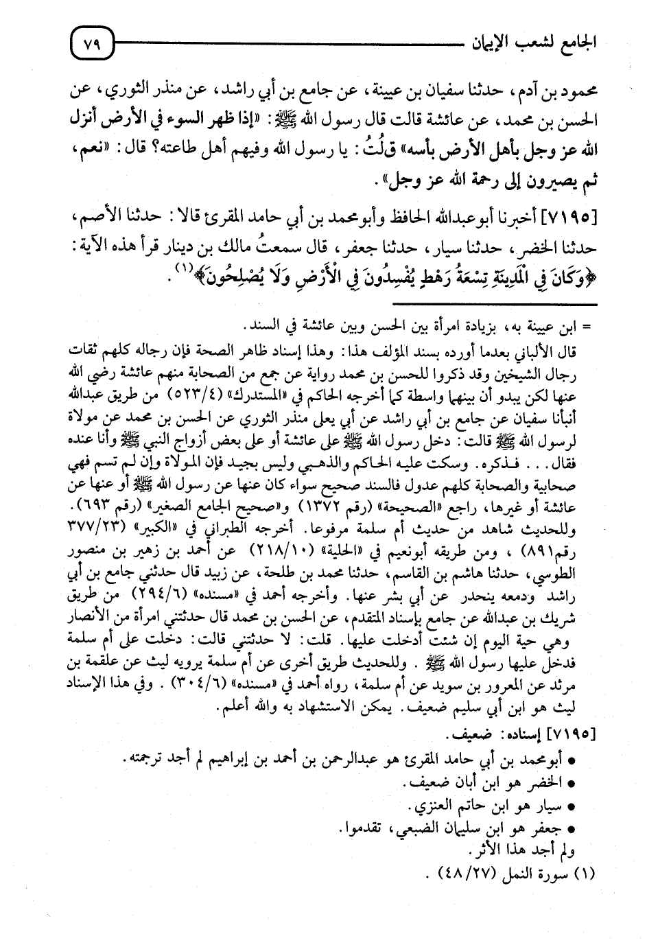 7195 - أَخْبَرَنَا أَبُو عَبْدِ اللهِ الْحَافِظُ، وَأَبُو مُحَمَّدِ بْنُ أَبِي حَامِدٍ الْمُقْرِئُ، قَالَا: نا الْأَصَمُّ، نا الْخَضِرُ، نا سَيَّارٌ، نا جَعْفَرٌ، سَمِعْتُ مَالِكَ بْنَ دِينَارٍ، قَرَأَ هَذِهِ الْآيَةَ: {§وَكَانَ فِي الْمَدِينَةِ تِسْعَةُ رَهْطٍ يُفْسِدُونَ فِي الْأَرْضِ وَلَا يُصْلِحُونَ} [النمل: 48]-[80]- قَالَ: " فَكَمِ الْيَوْمَ فِي كُلِّ قَبِيلَةٍ، وَحَيٍّ مِنَ الَّذِينَ يُفْسِدُونَ فِي الْأَرْضِ، وَلَا يُصْلِحُونَ؟ "