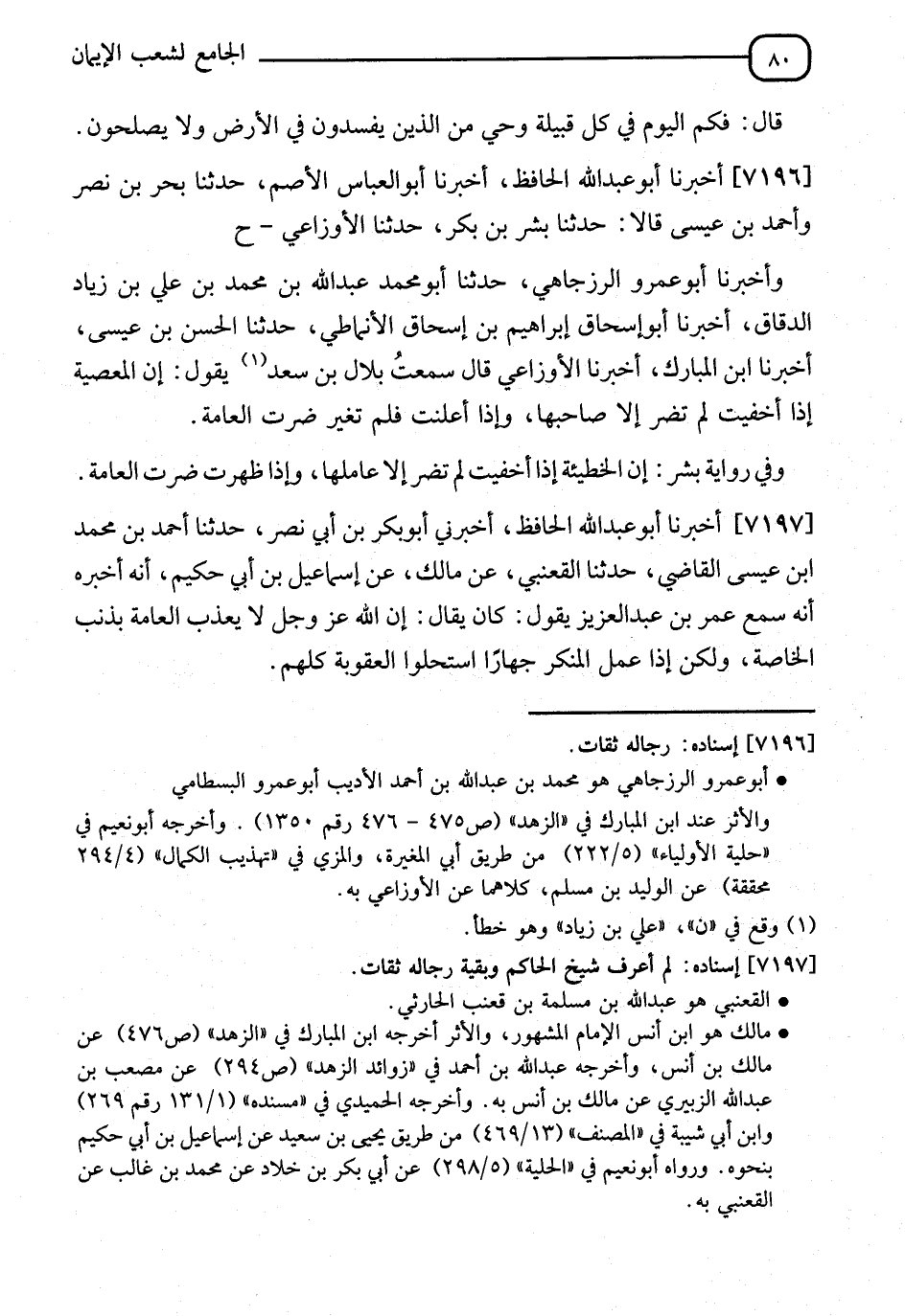7196 - أَخْبَرَنَا أَبُو عَبْدِ اللهِ الْحَافِظُ، نا أَبُو الْعَبَّاسِ الْأَصَمُّ، نا بَحْرُ بْنُ نَصْرٍ، وَأَحْمَدُ بْنُ عِيسَى، قَالَا: نا بِشْرُ بْنُ بَكْرٍ، نا الْأَوْزَاعِيُّ، ح وَأَخْبَرَنَا أَبُو عَمْرٍو الرَّزْجَاهِيُّ، نا أَبُو مُحَمَّدٍ عَبْدُ اللهِ بْنُ مُحَمَّدِ بْنِ عَلِيِّ بْنِ زِيَادٍ الدَّقَّاقُ، أنا أَبُو إِسْحَاقَ إِبْرَاهِيمُ بْنُ مُحَمَّدٍ الْأَنْمَاطِيُّ، نا الْحُسَيْنُ بْنُ عِيسَى، أنا ابْنُ الْمُبَارَكِ، أنا الْأَوْزَاعِيُّ، سَمِعْتُ بِلَالَ بْنَ سَعْدٍ يَقُولُ: " إِنَّ §الْمَعْصِيَةَ إِذَا خَفِيَتْ لَمْ تَضُرَّ إِلَّا صَاحِبَهَا، وَإِذَا أُعْلِنَتْ فَلَمْ تُغَيَّرْ ضَرَّتِ الْعَامَّةَ " وَفِي رِوَايَةِ ابْنِ بِشْرَانَ: " إِنَّ الْخَطِيئَةَ إِذَا خَفِيَتْ لَمْ تَضُرَّ، إِلَّا عَامِلَهَا، وَإِذَا ظَهَرَتْ ضَرَّتِ الْعَامَّةَ "
